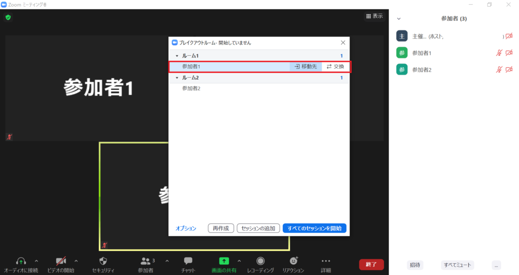 画面のルーム1にいる参加者の名前(ここでは「参加者1」)にカーソルをあわせると、「移動先」「交換」と表示されます。