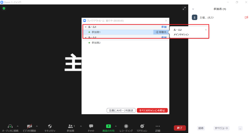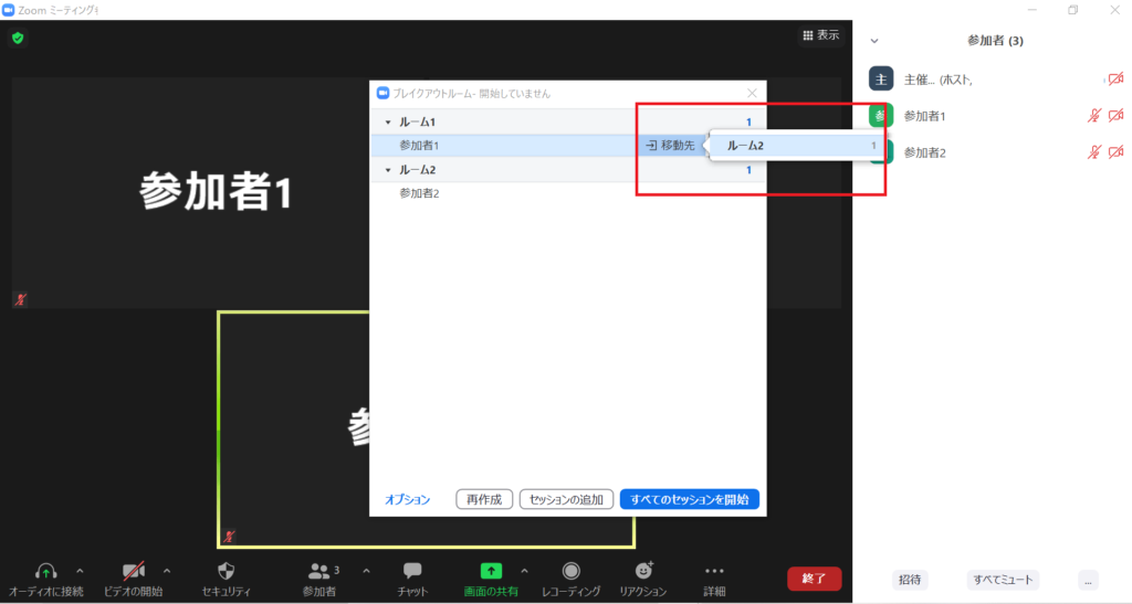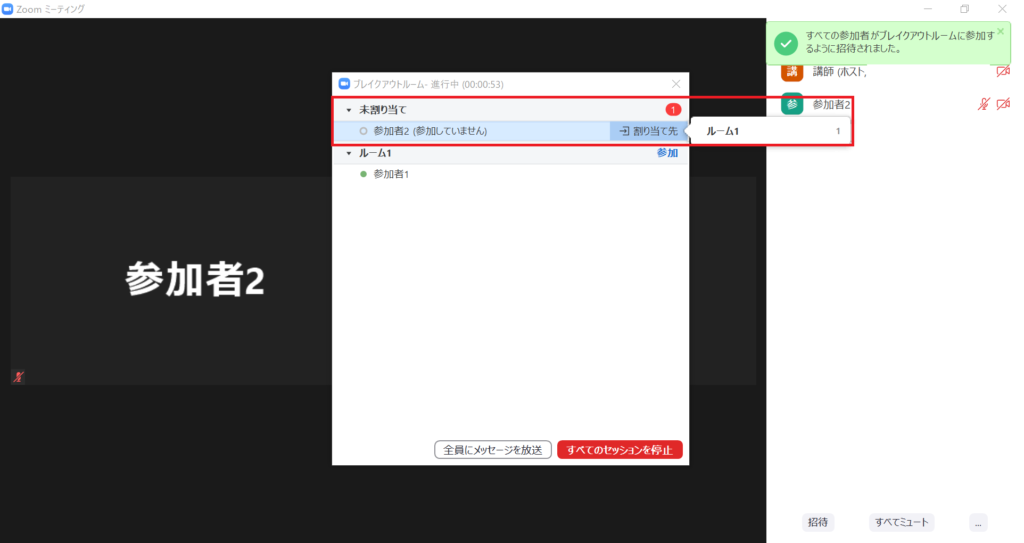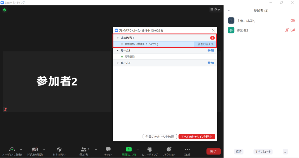 無事、ブレイクアウトルーム進行中に参加者2を割り当てることができました。