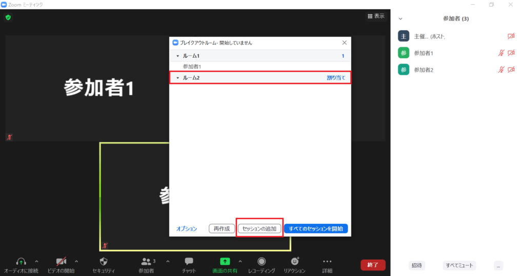 ルーム1とは別のルームに割り当てたい場合、「セッションの追加」をクリックし、ルームを増やします。