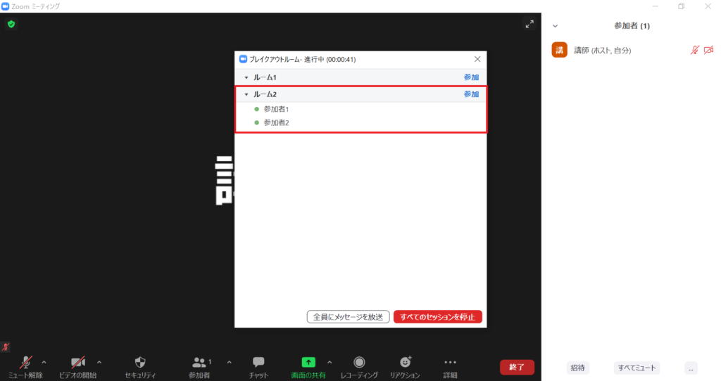 先ほどと同様に、「すべてのセッションを開始」をクリックすると、ブレイクアウトルームがスタートします。