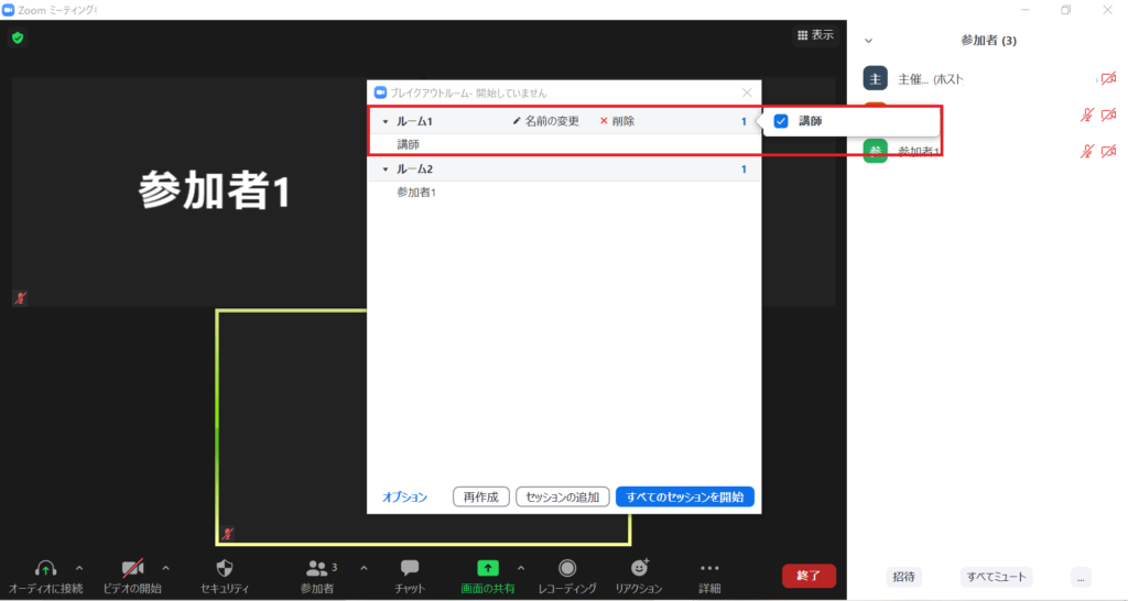 この状態でブレイクアウトルームをスタートすると、講師がブレイクアウトルームに送られることはありません。