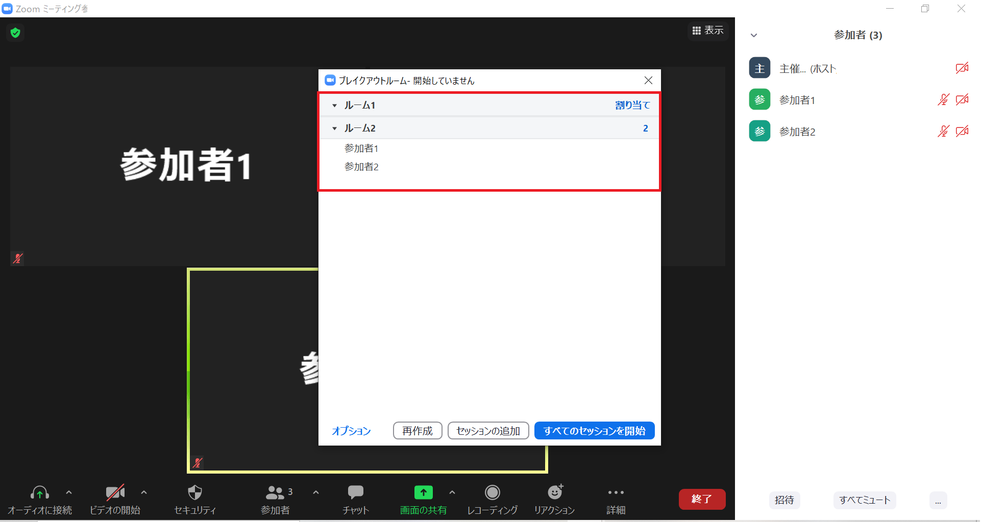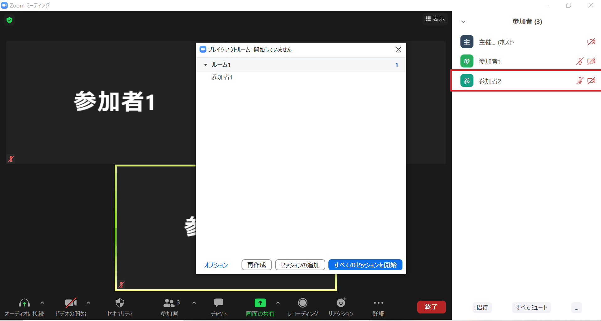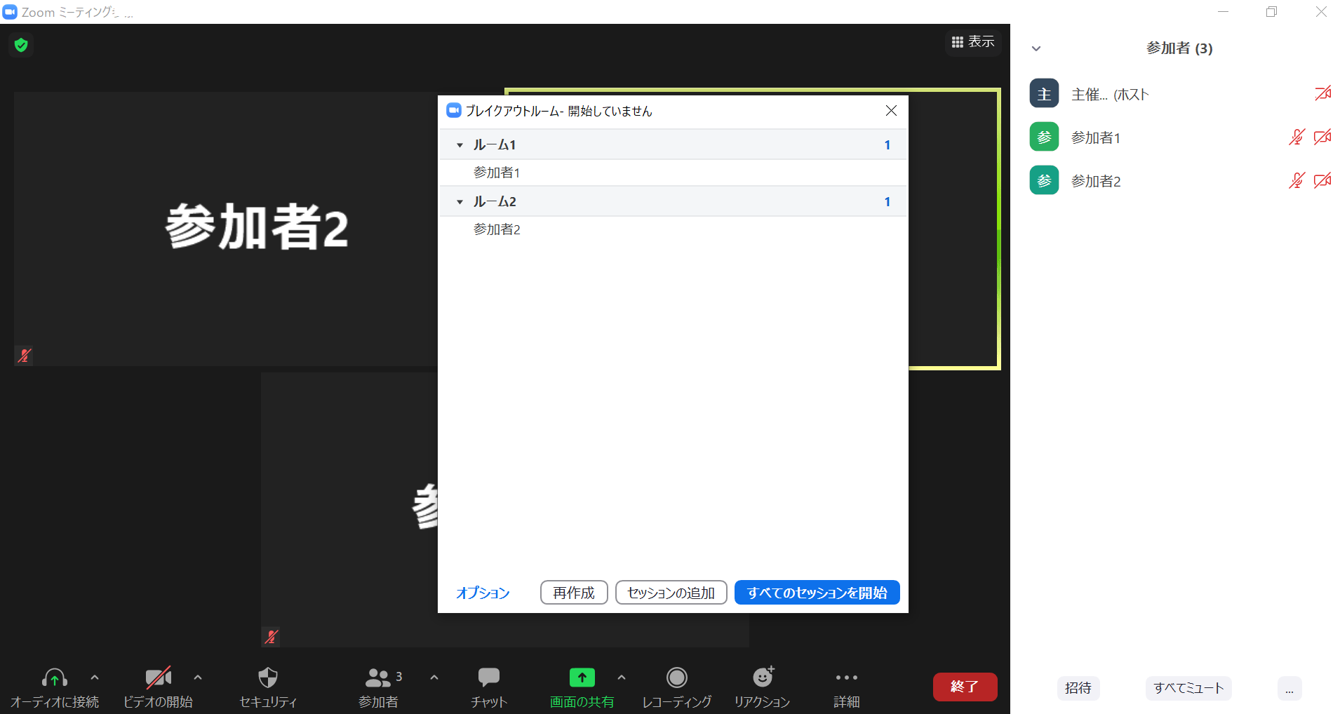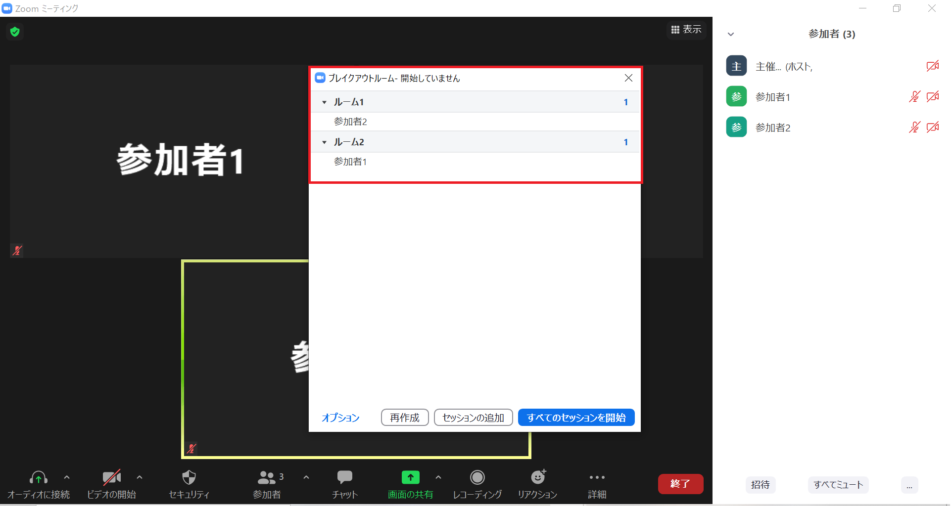 先ほどと同様に、「すべてのセッションを開始」をクリックすると、ブレイクアウトルームがスタートします。