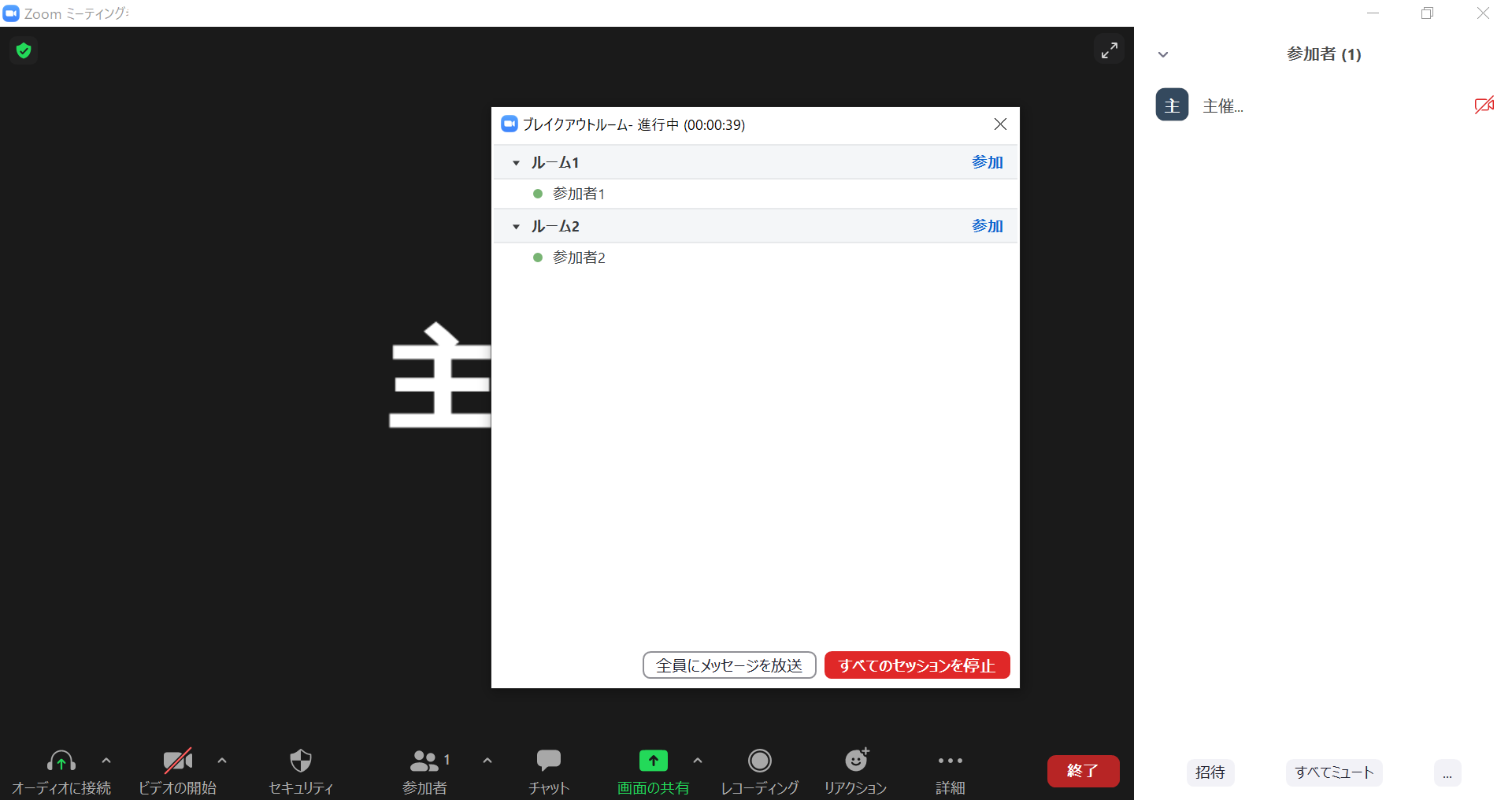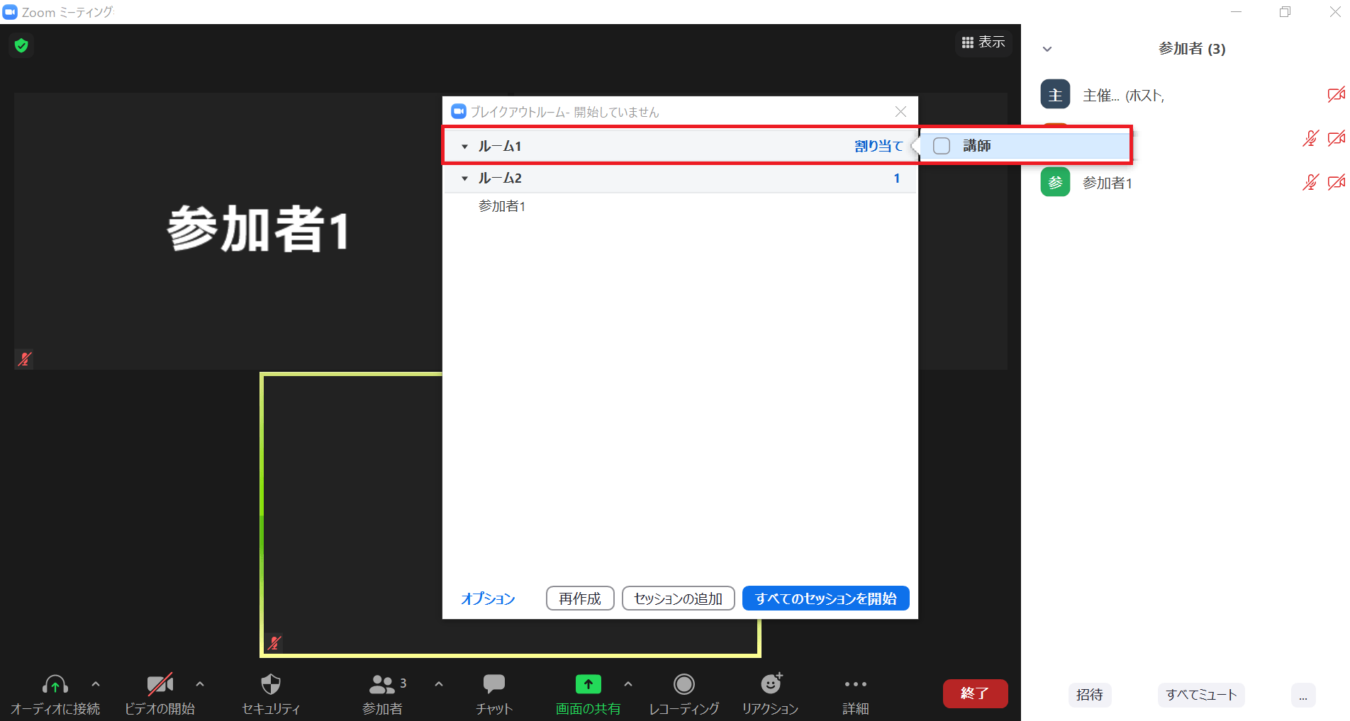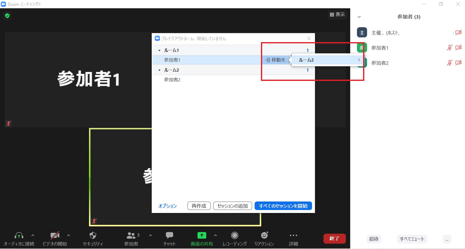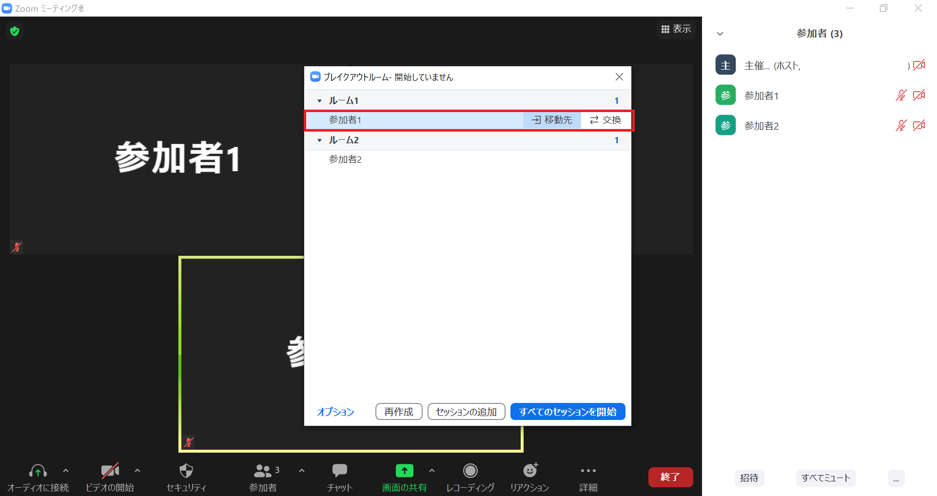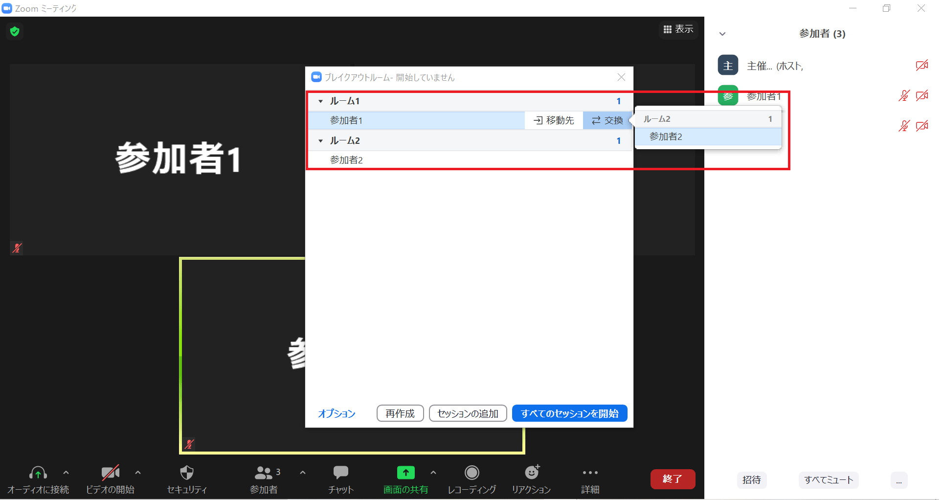 先ほどと同様に、「すべてのセッションを開始」をクリックすると、ブレイクアウトルームがスタートします。