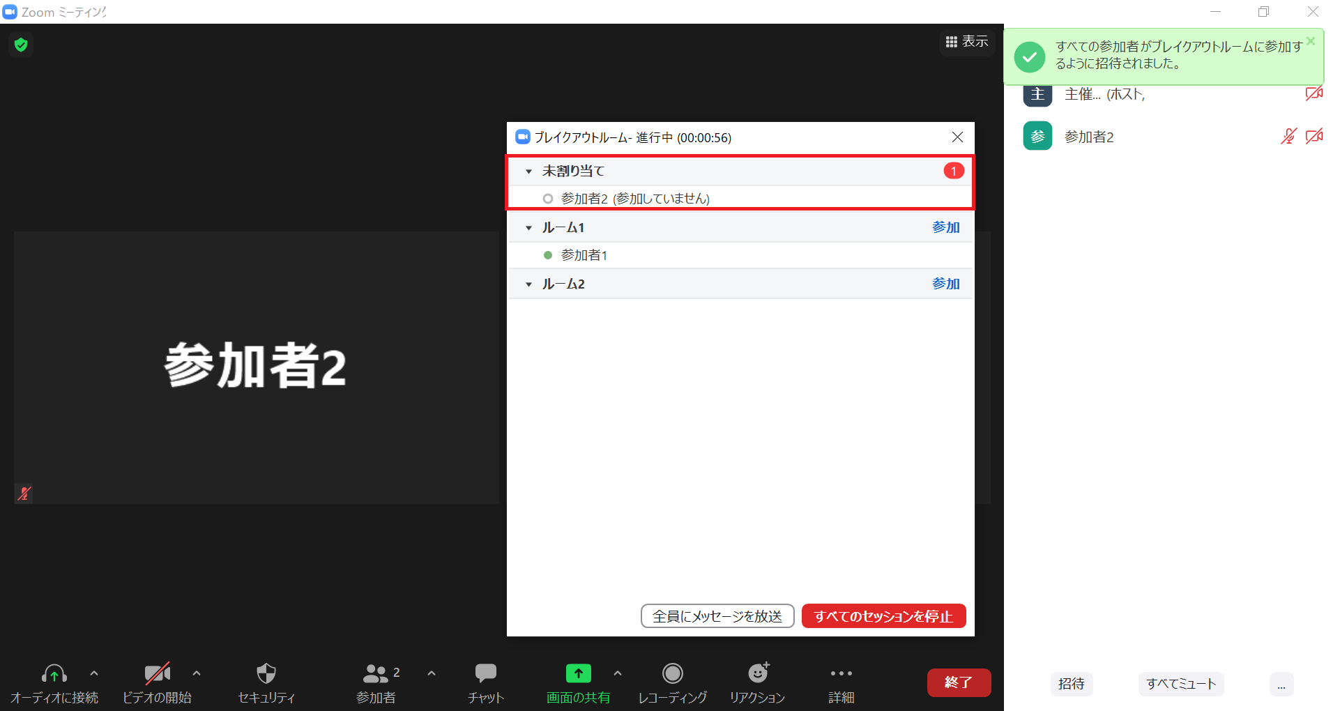 無事、ブレイクアウトルーム進行中に参加者2を割り当てることができました。