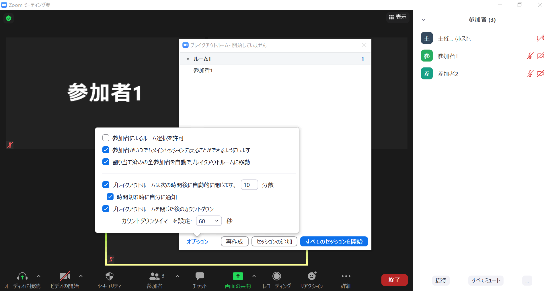 この状態で「すべてのセッションを開始」をクリックすると、ブレイクアウトルームがスタートします。