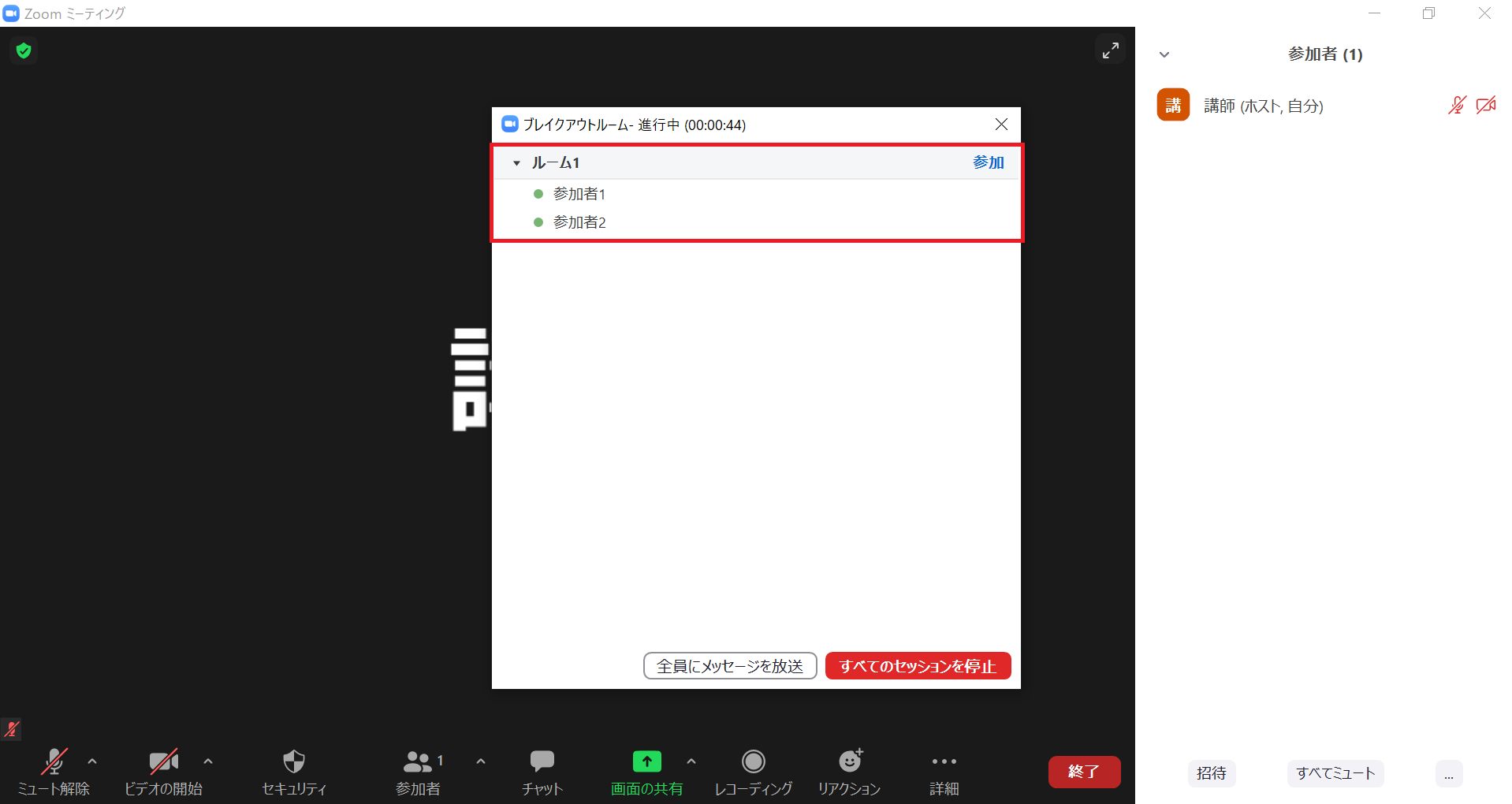 このまま2回目のブレイクアウトルームをスタートさせると、講師や主催者もそのままブレイクアウトルームに参加することに。