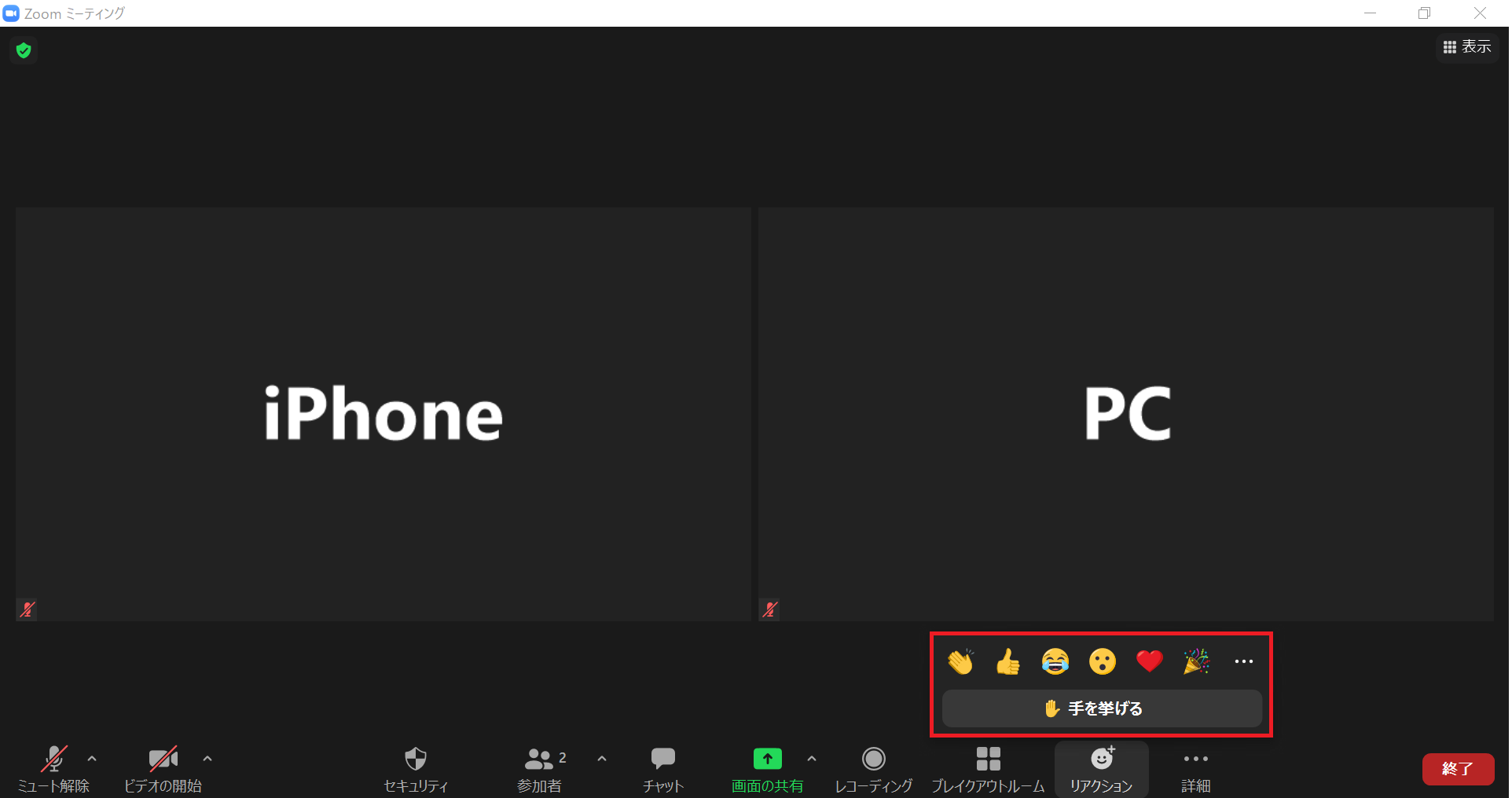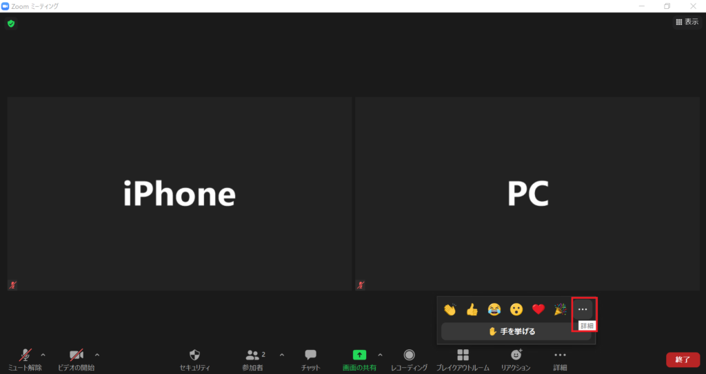 いくつかのリアクションマークと、その下に「手を挙げる」という表示が出てきます。