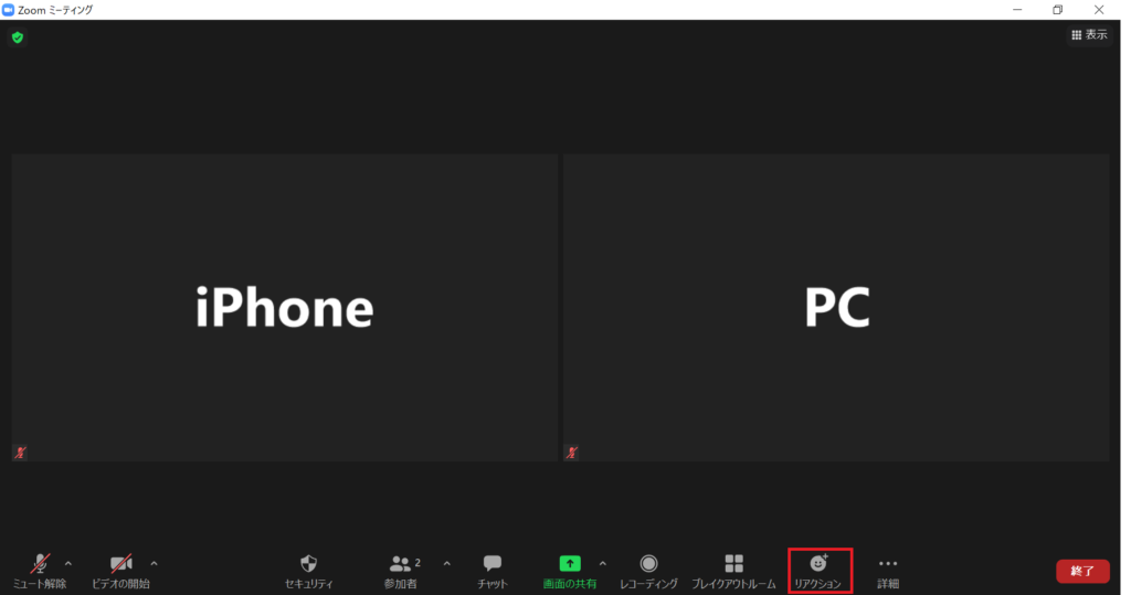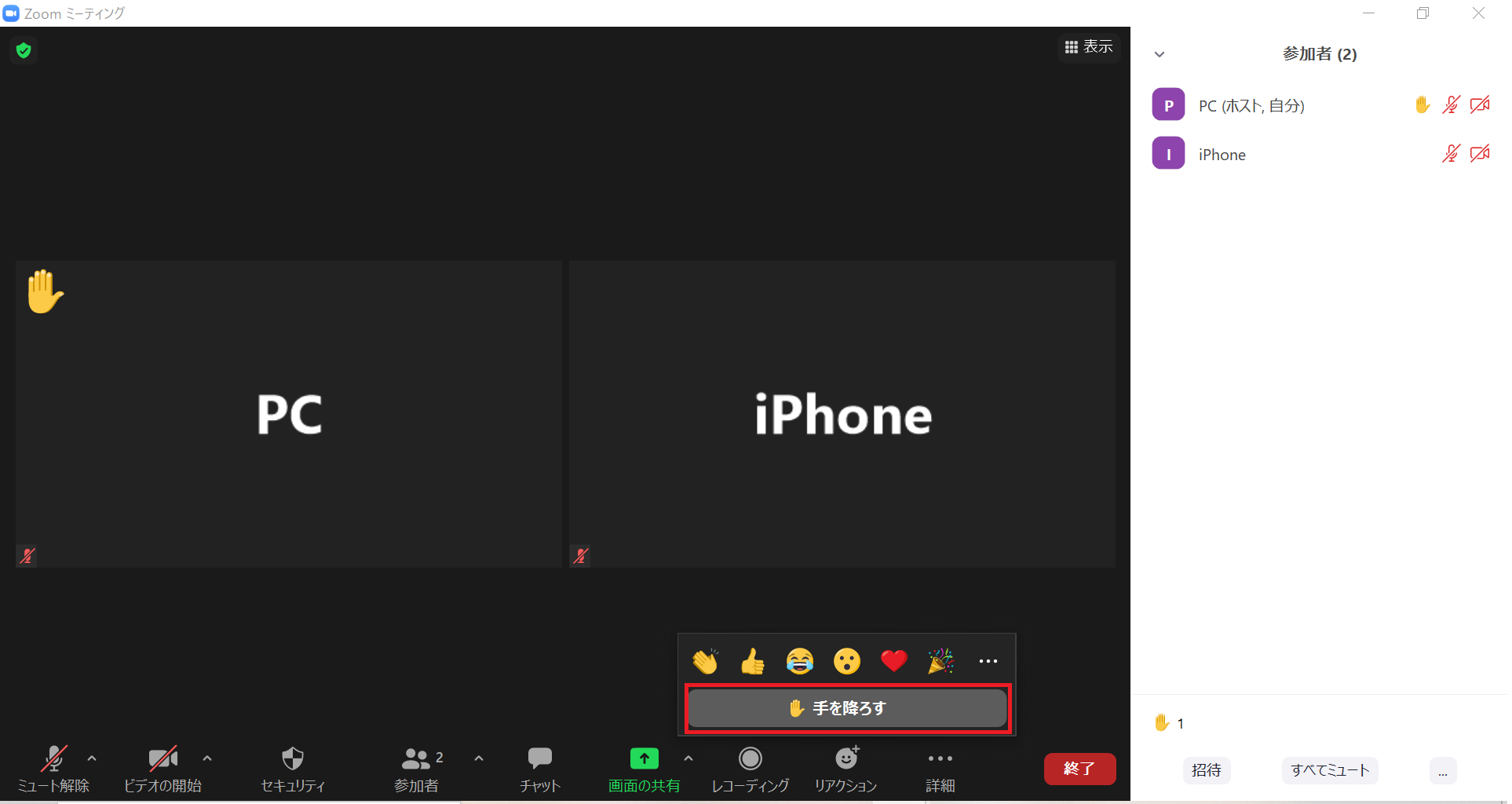 手を降ろす際には、手を挙げたときと同様に、「リアクション」から