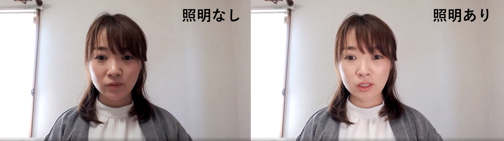 私は、リングライトを使用しており、仕事部屋はとても明るいのですが、リングライトを使用しないと顔が暗く見えてしまいます。光をぱっと顔に当てるだけで、随分と印象が変わります。