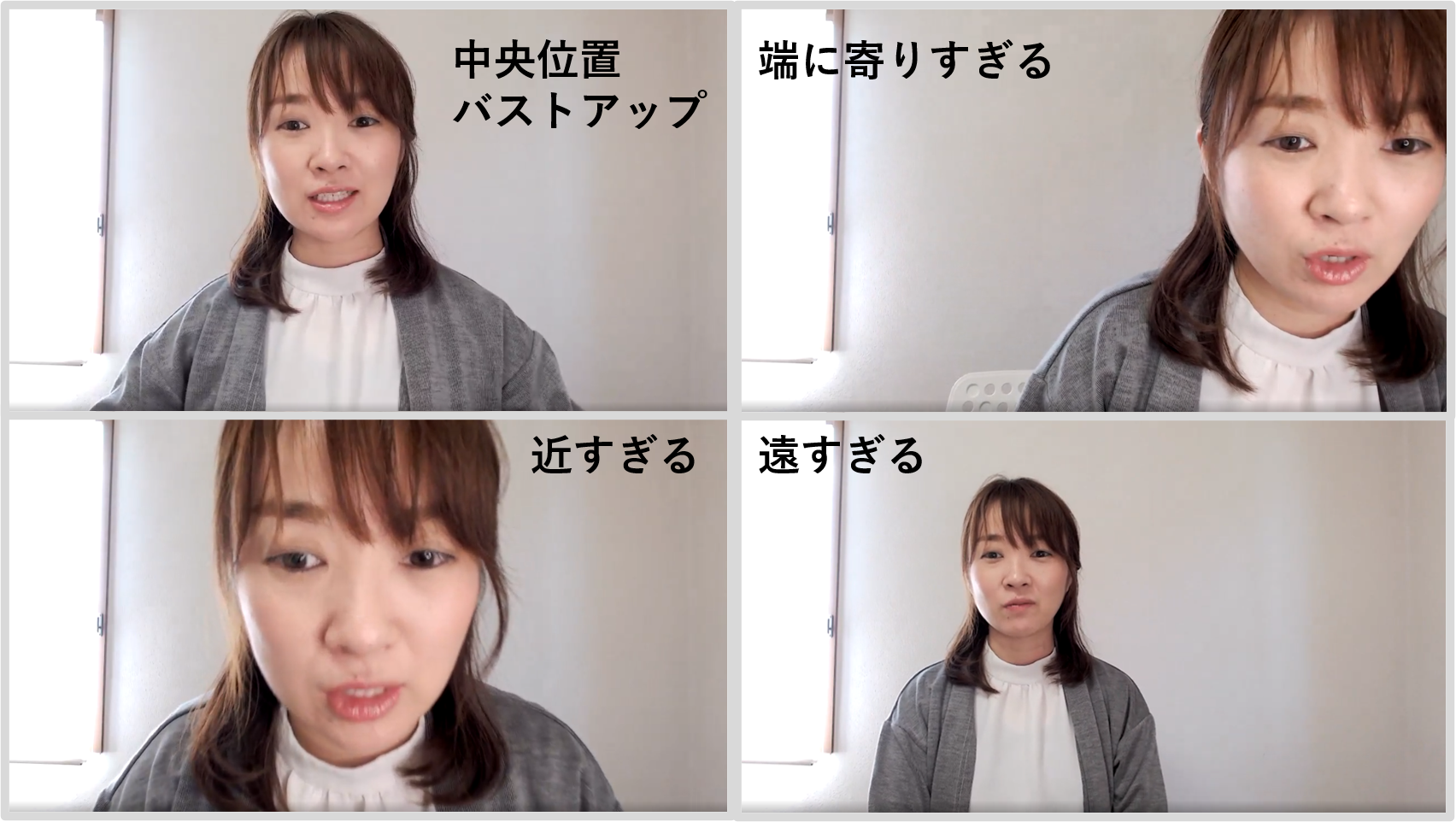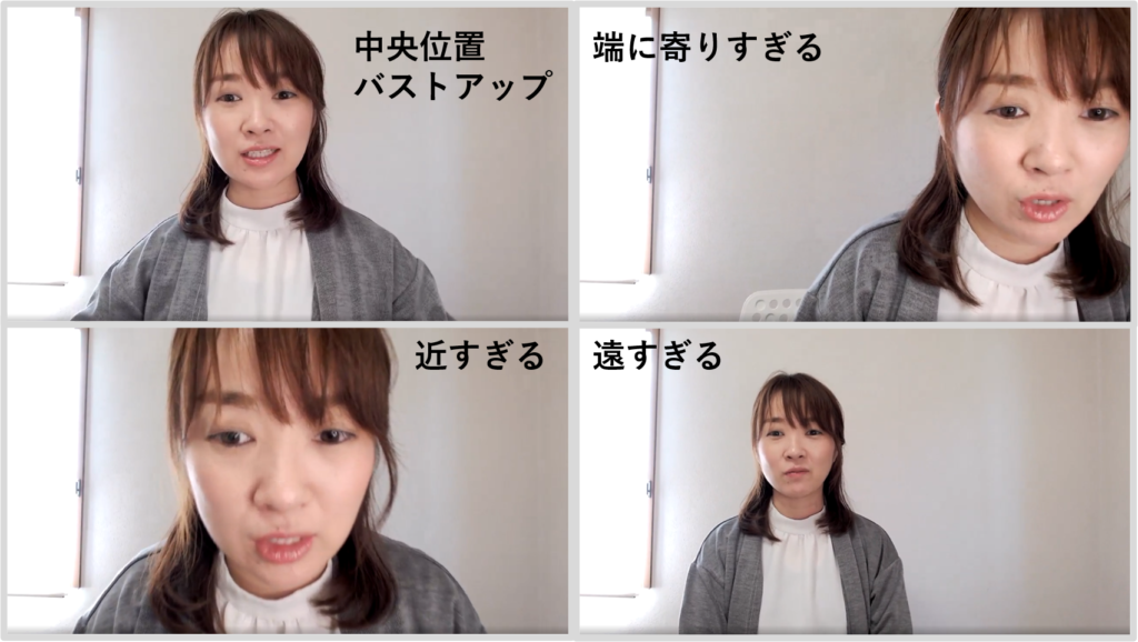 近すぎて顔だけになるとか、逆に遠すぎてしまうとか、ご自身では気づかないかもしれませんが、画面上でとても違和感が出てしまうので注意が必要です。