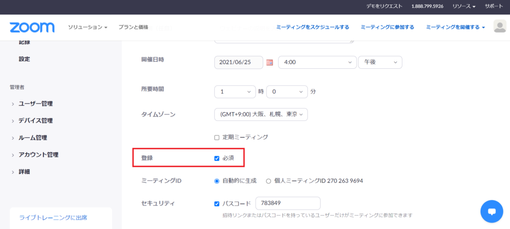 1.ホストがミーティングの設定画面から「登録」の必須にチェックを入れる