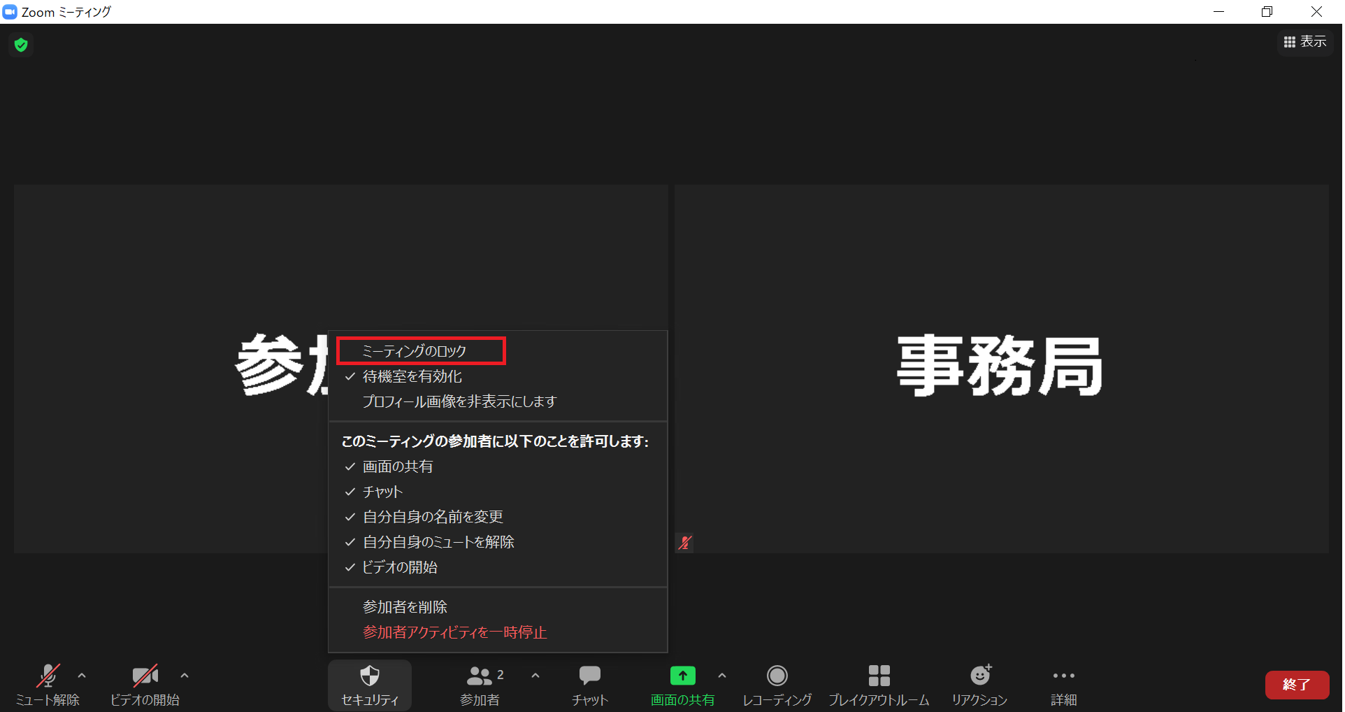 「ミーティングのロック」は、その名のとおり、ミーティングをロックする機能です。