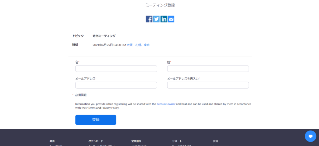 こちらは、ホストから参加者へご案内のURLを送信しますが、そのURLは「参加するための登録画面」につながります。