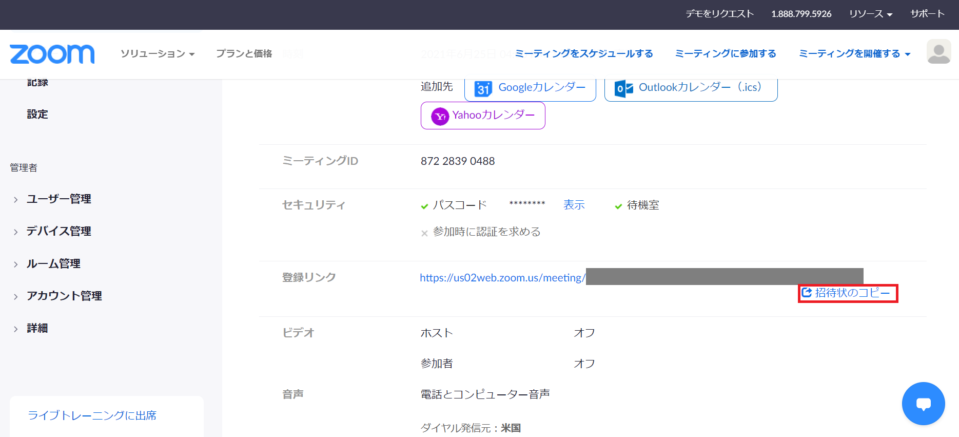 3.保存後、ミーティングを開き、登録リンクをクリック