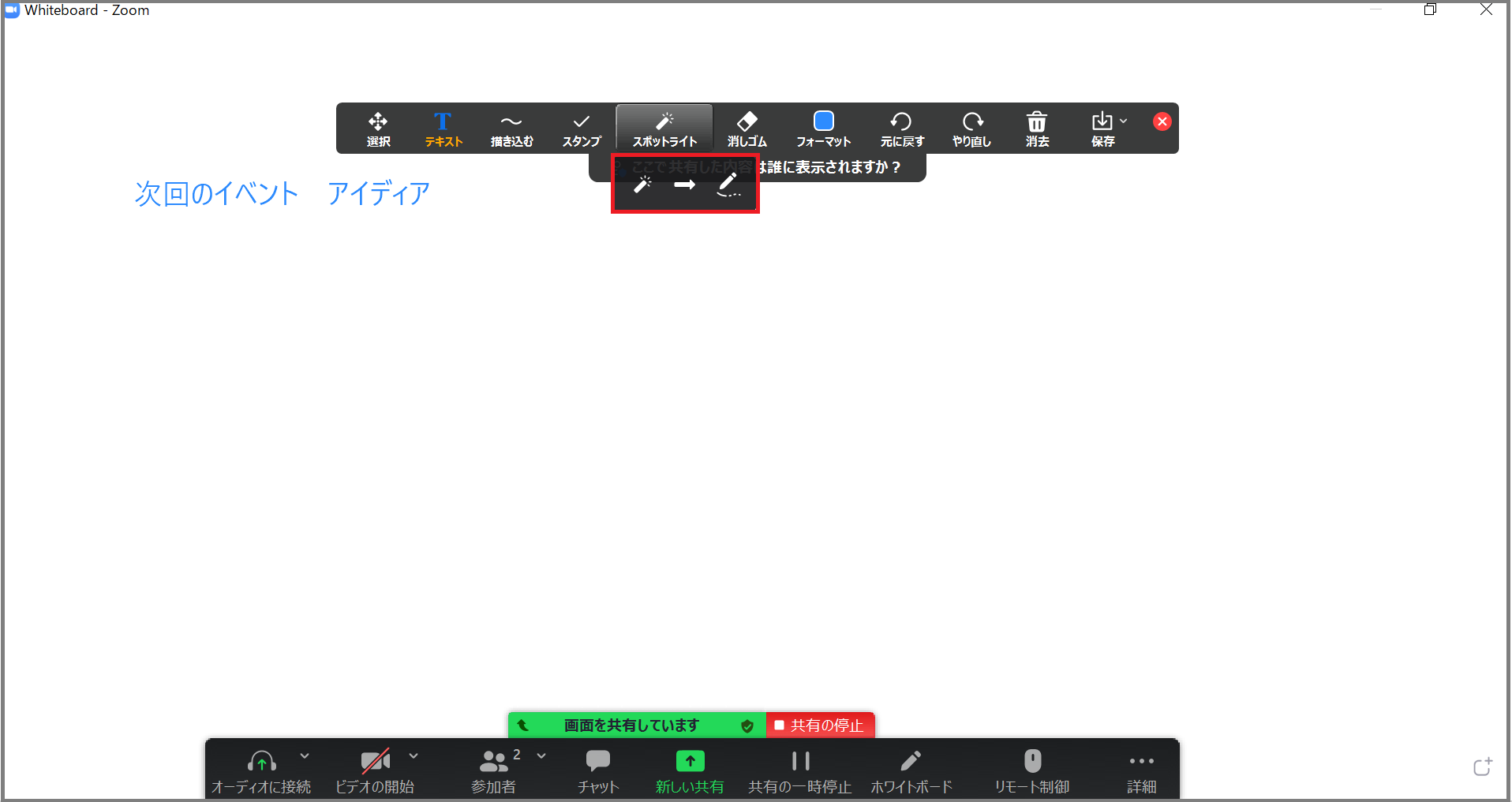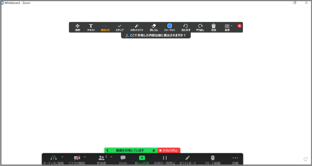 書き込みや保存機能は、通常の画面共有時にも利用できます。手順は今回のホワイトボードと同様です。