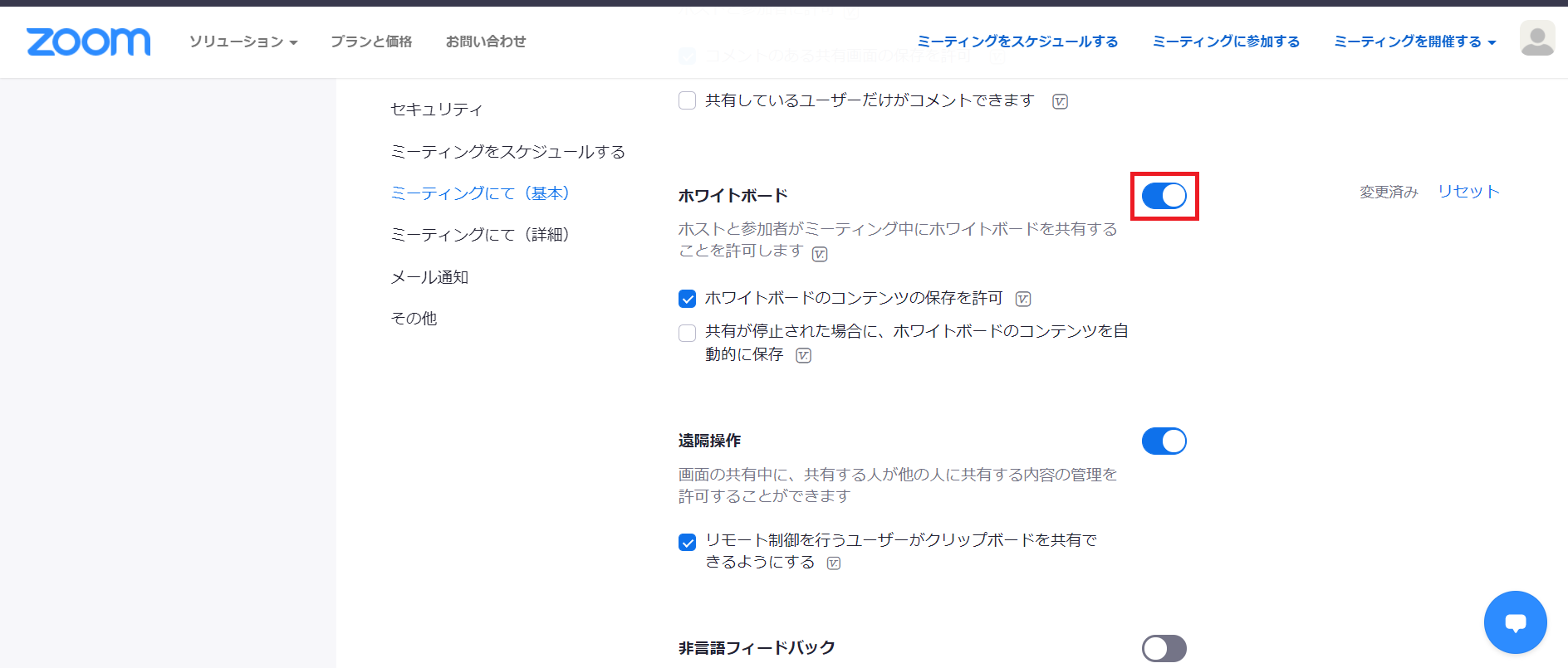 設定画面から、「ホワイトボード」がオン設定になっているか確認しましょう。