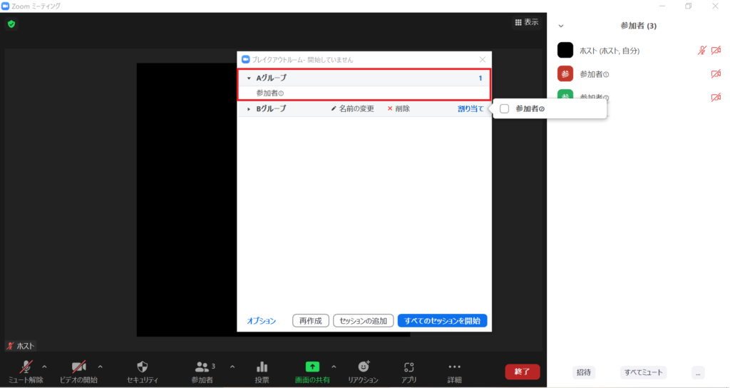 (ブレイクアウトルームを使用しなくても、「すべてのセッションを開始」さえクリックしなければ、ブレイクアウトルームで確認するのも1つの手かもしれません)