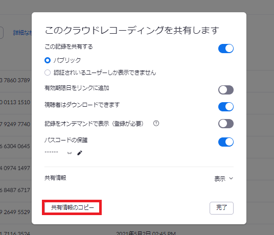 新たに画面が出てくるので「共有情報をコピー」しましょう。