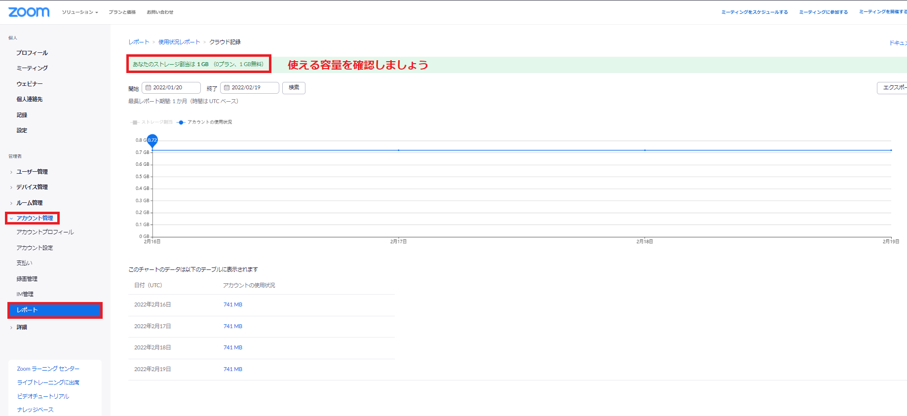 (「アカウント管理」→「レポート」→「クラウド記録」から確認できます)