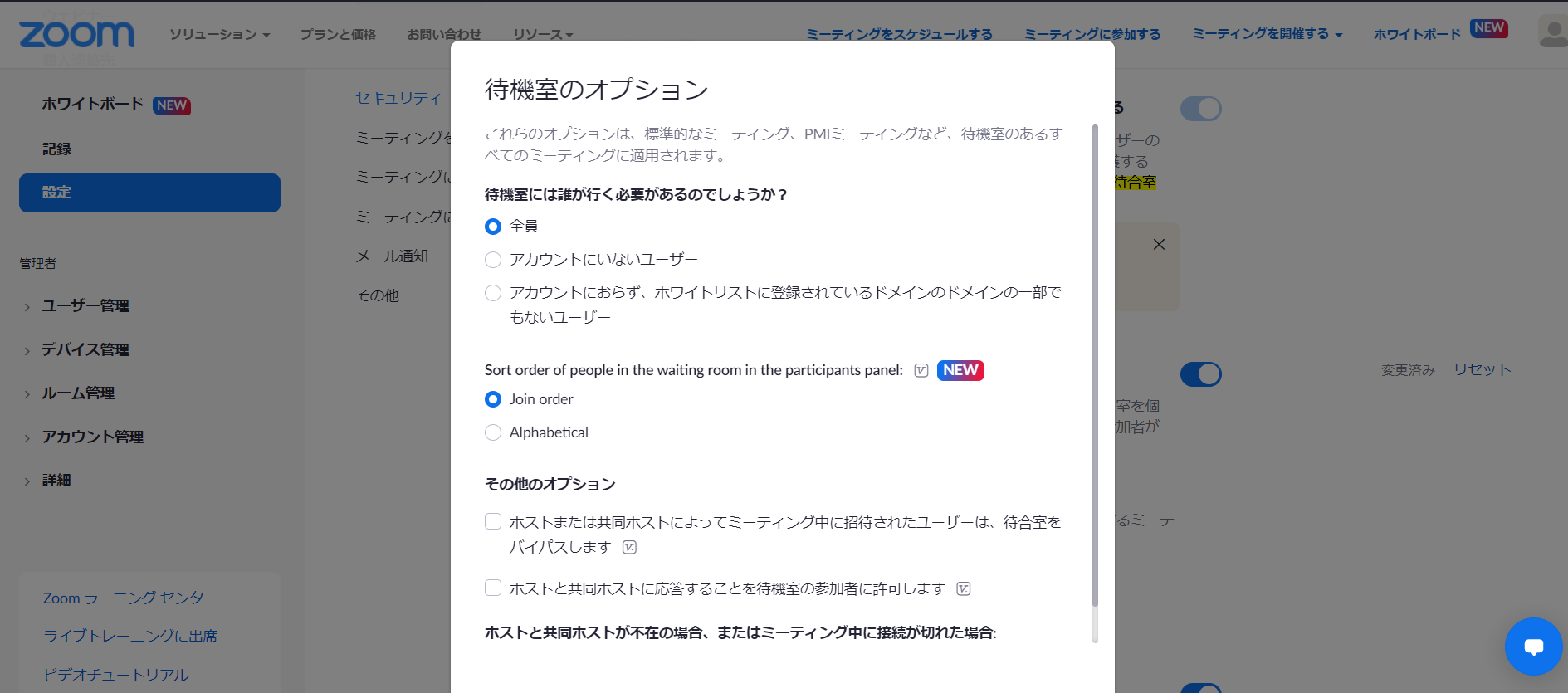 ホストは、現在Waiting Roomにいる参加者を年代順またはアルファベット順に表示することを選択できます。この設定は、Webポータルの待合室のカスタマイズ設定で行います。この機能を使用するには、バージョン 5.10.3 以降が必要です。