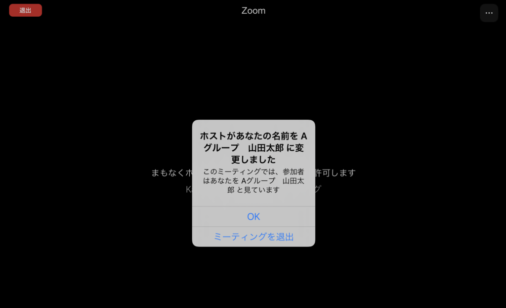変更された参加者の画面には、「OK」か「退出」を選択するよう表示されます。