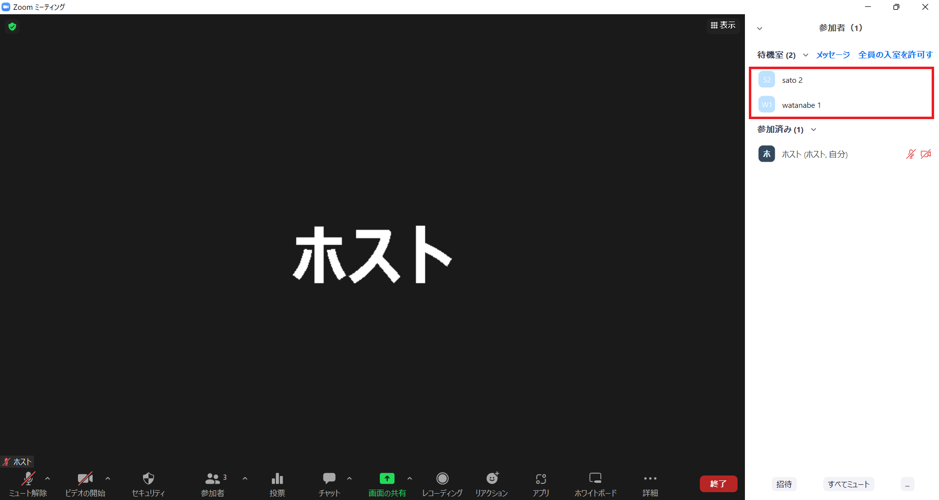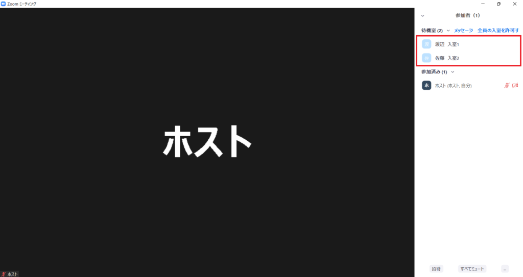 また、待機室での名前が「iPhone」など事前にどなたかわからない場合は判別ができませんので、相手に変更してもらう必要があります。