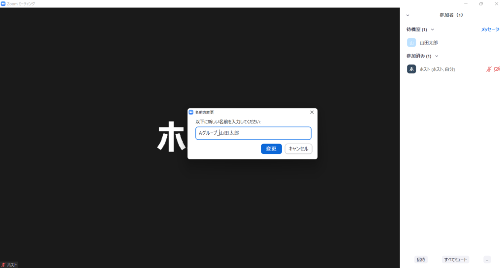 とはいえ、企業研修などであれば、名前自体は変更したけれど、「名前の前にグループ名を入れる必要があったのを忘れている」ということはあるかもしれません。そんなときにはメッセージを送るか事前にアナウンスすることで、ホスト側で変更するのは運営側としてひとつの手段かと思います。