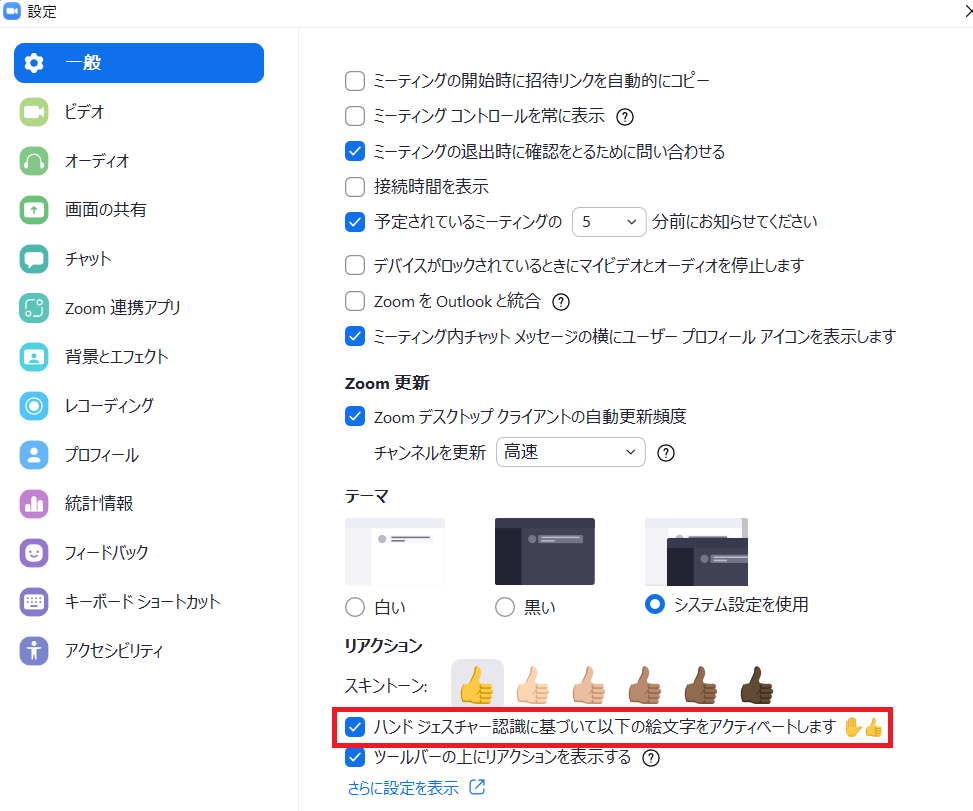 「ハンドジェスチャー認識に基づいて以下の絵文字をアクティベートします」にチェックを入れます。これで準備完了です。