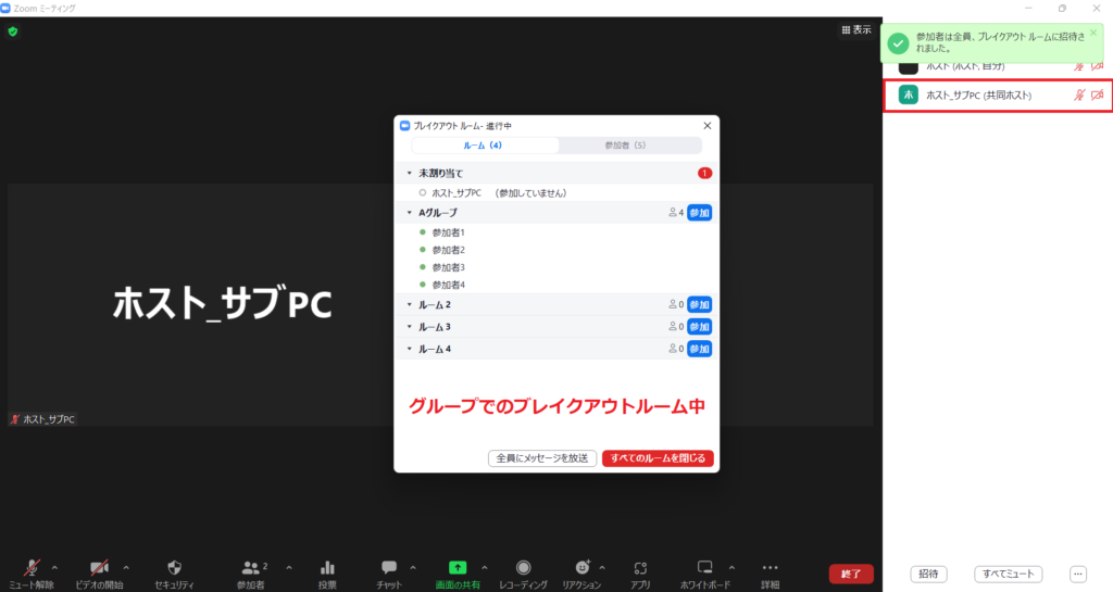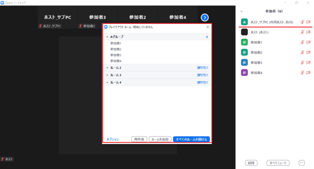 サブPCを共同ホストにして、直前のブレイクアウトルームを利用する