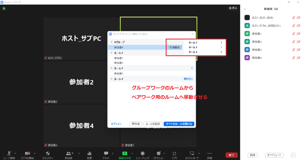 サブPCのブレイクアウトルームを開くと、ペアワーク設定前のブレイクアウトルームが残っています。
