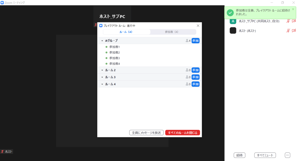 ホスト画面で見てみると、グループでのブレイクアウトルームがスタートしていました。