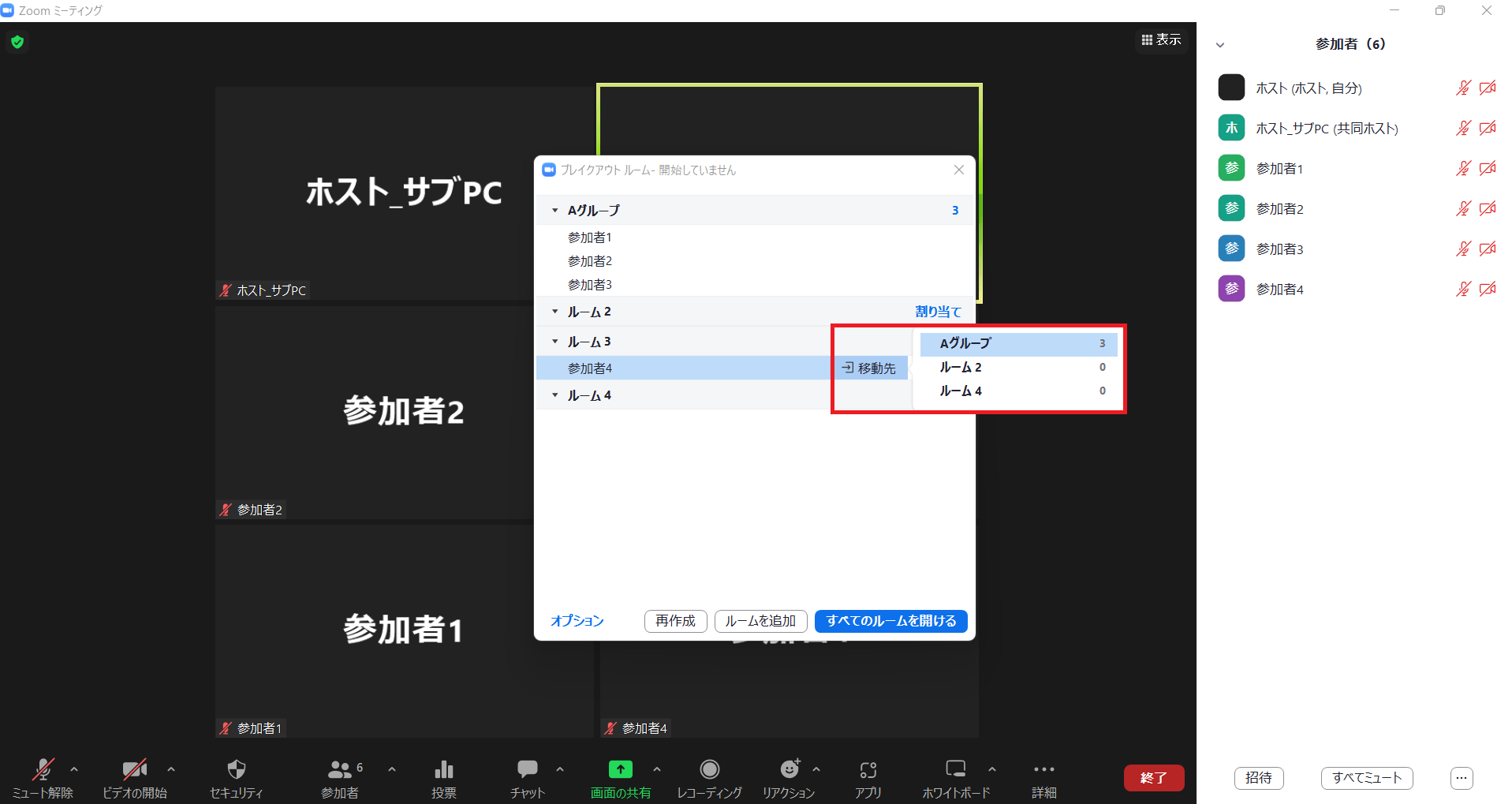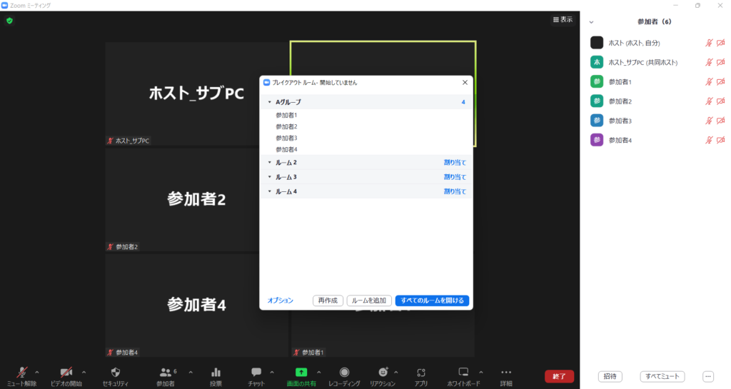 ホスト画面で見てみると、グループでのブレイクアウトルームがスタートしていました。