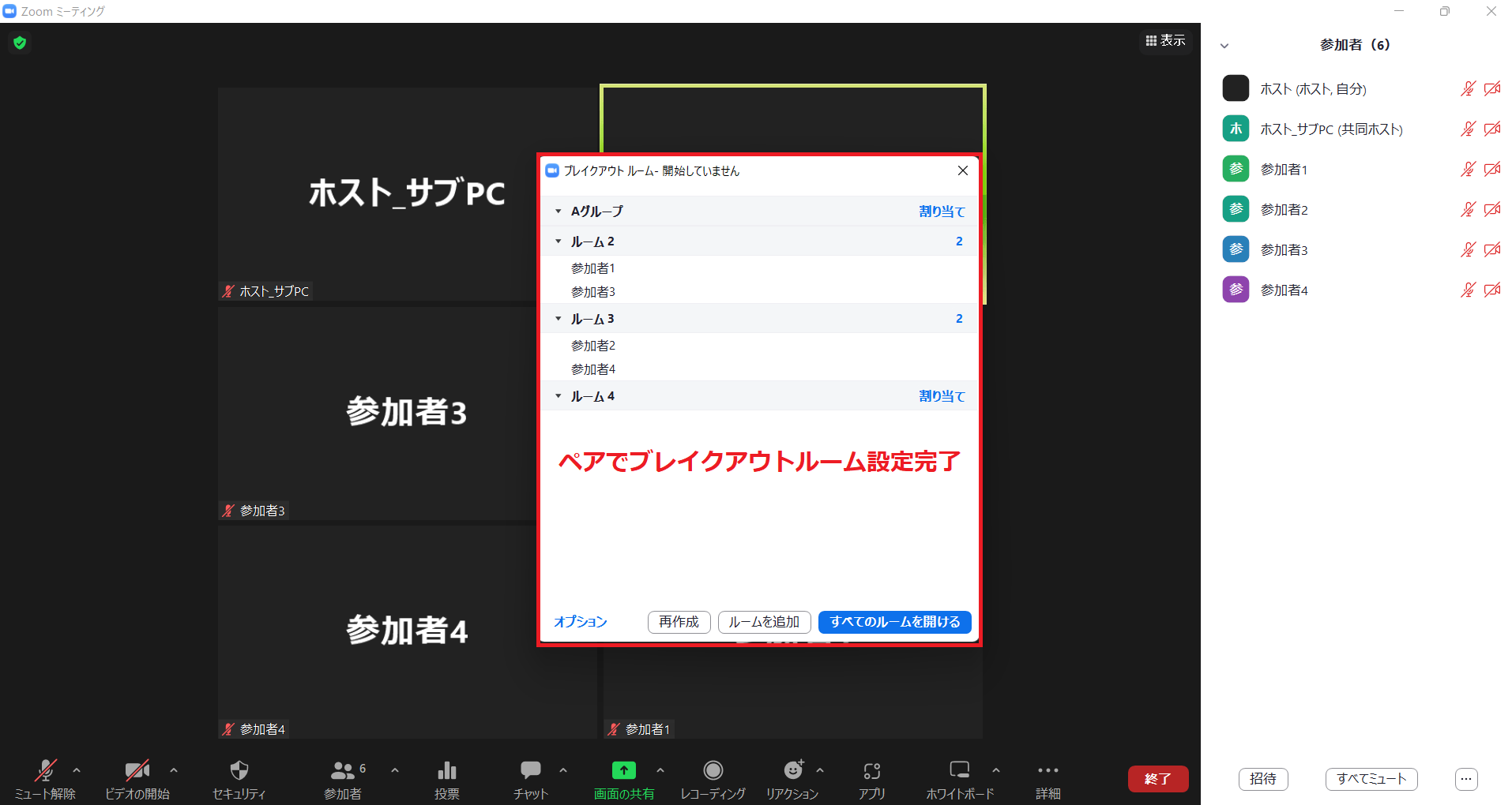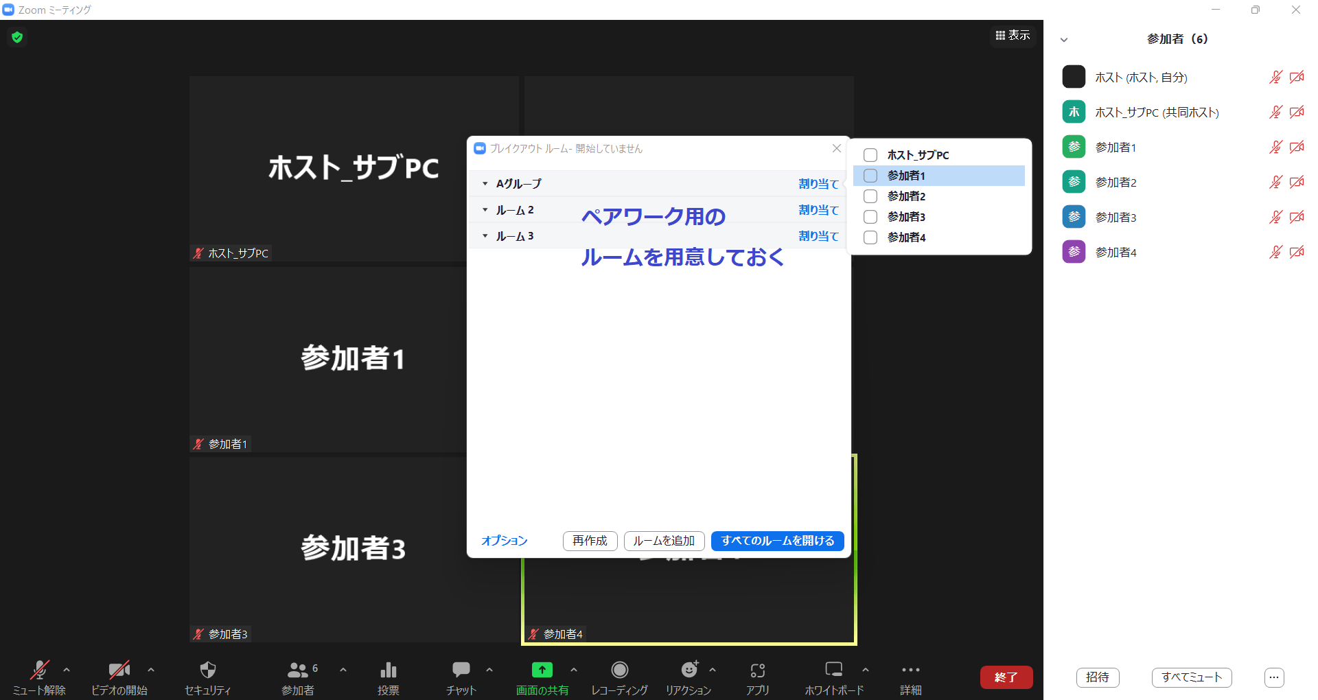 (メインPCではペアワークのブレイクアウトルーム設定完了)