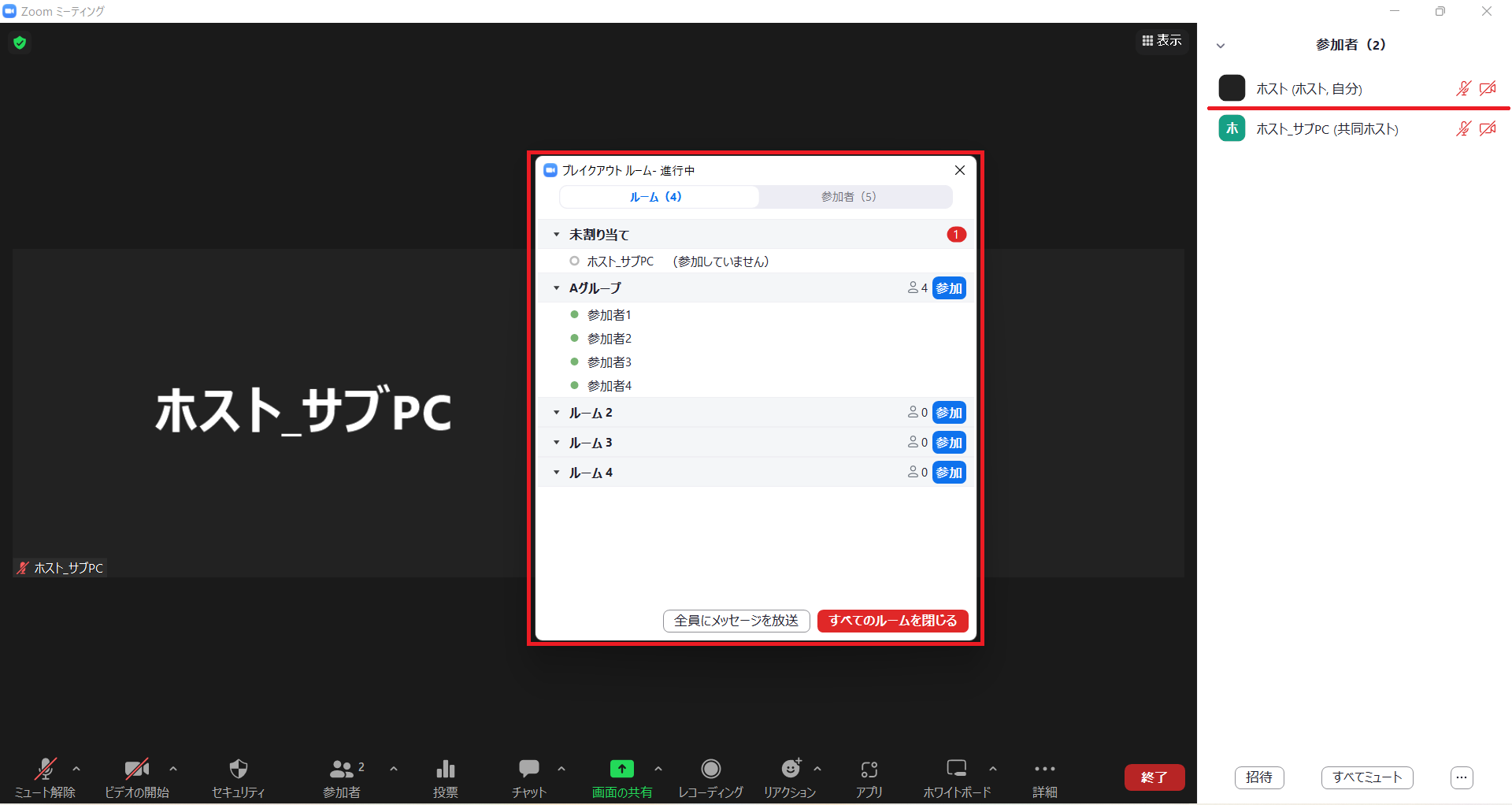 サブPCを共同ホストにして、直前のブレイクアウトルームを利用する