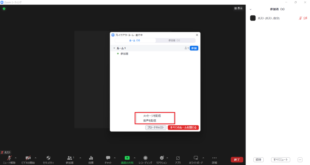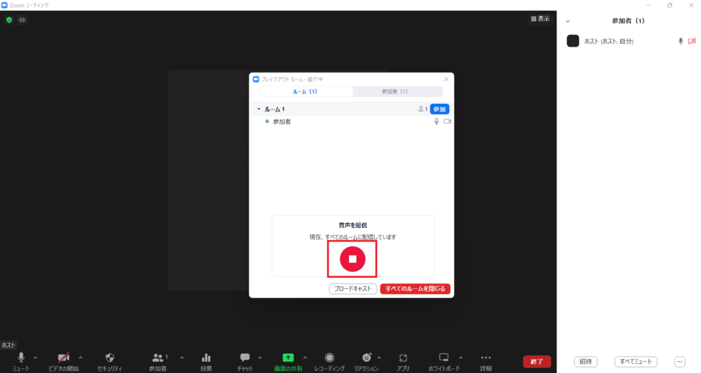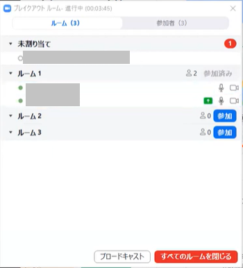 参加者をブレイクアウトルームに送ったあと、「ブロードキャスト」ボタンをクリック。