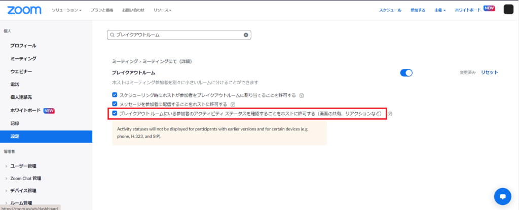 まずは設定画面にて「ブレイクアウト ルームにいる参加者のアクティビティ ステータスを確認することをホストに許可する(画面の共有、リアクションなど)」にチェックを入れましょう。
