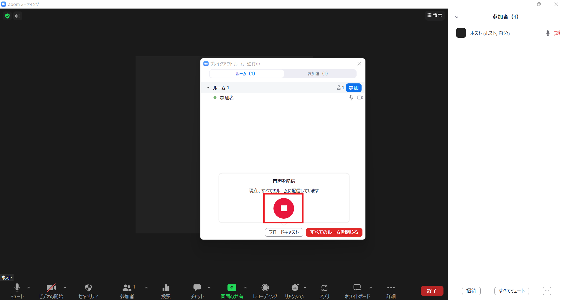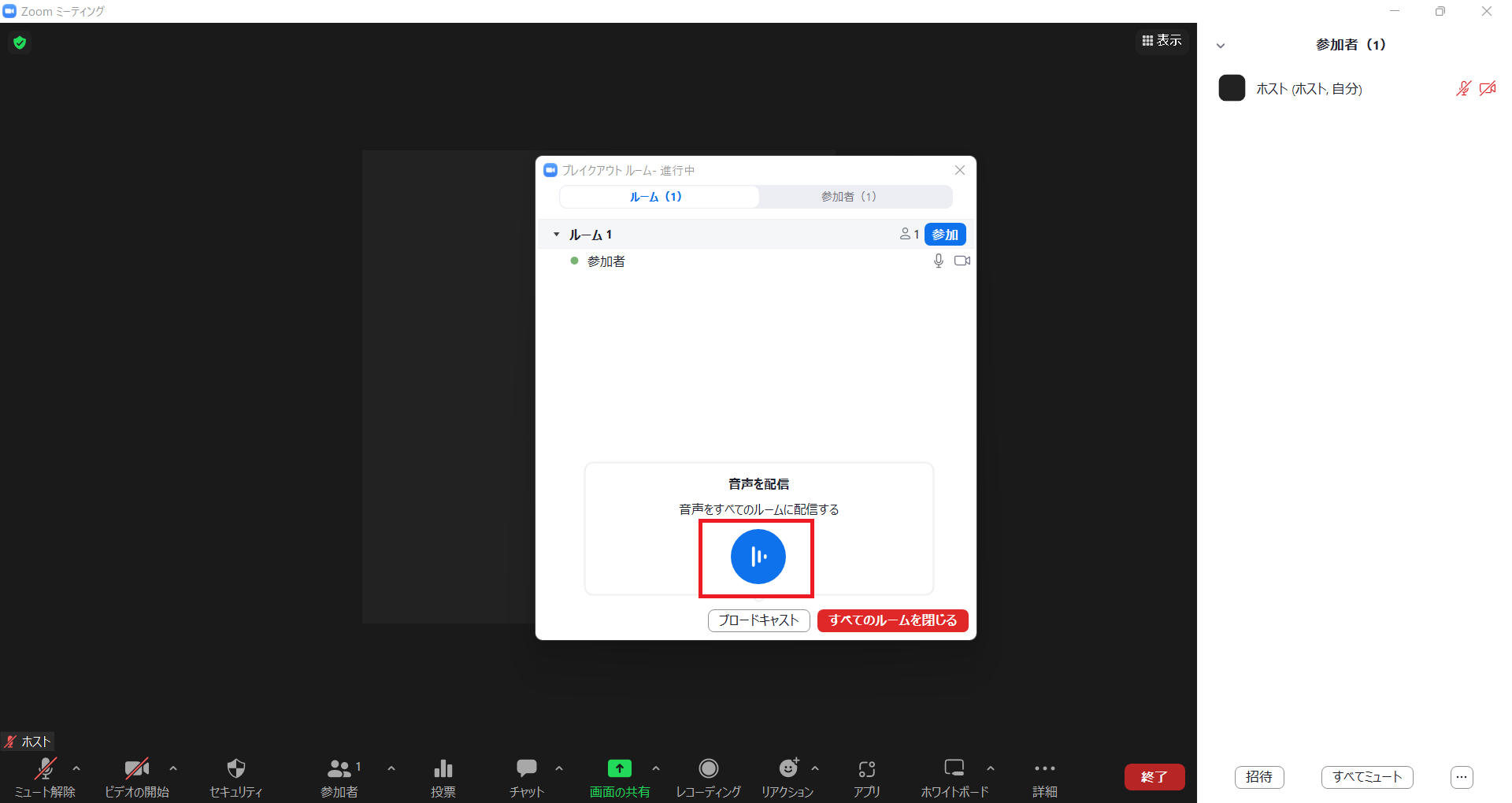 参加者をブレイクアウトルームに送ったあと、「ブロードキャスト」ボタンをクリック。