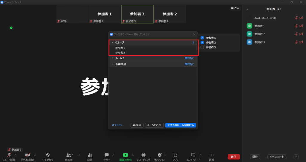 メインルームに残した「参加者3」を、全体のブレイクアウトルームを開始してから移動させるか、