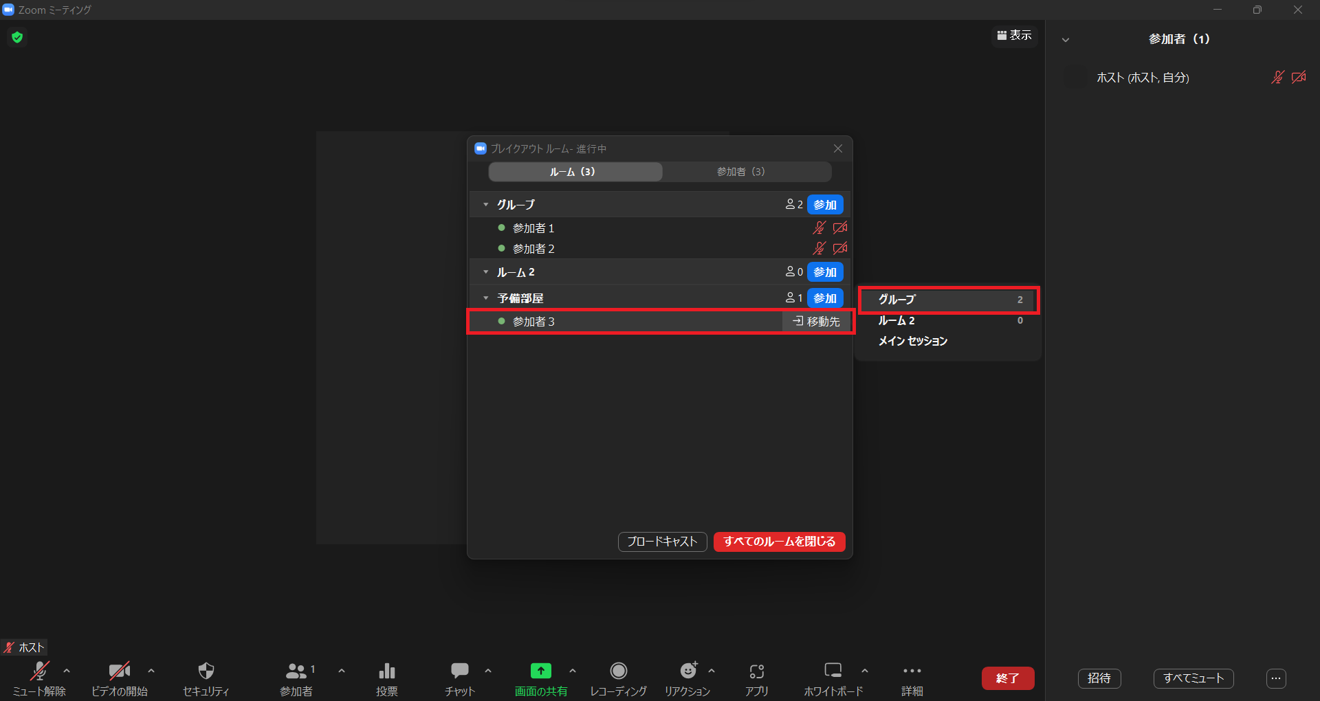 メインルームに残した「参加者3」を、全体のブレイクアウトルームを開始してから移動させるか、