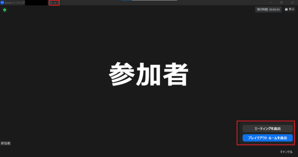 (カーソルを動かし、左上にルーム名が出ていて、右下「退出する」をクリックした画面)
