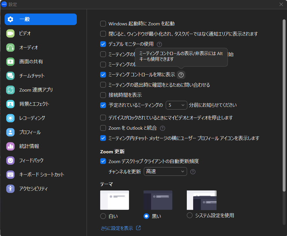 設定方法は、先日ご紹介した「ミーティングコントロールを常に表示」にチェックを入れること。
