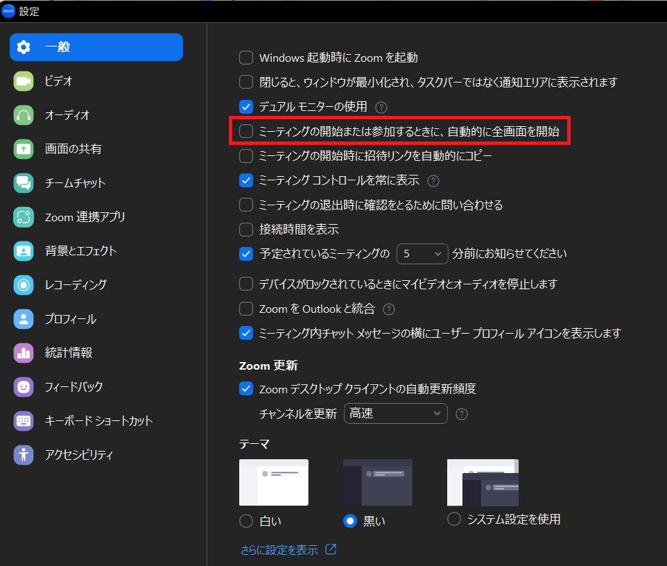 「ミーティングの開始または参加するときに、自動的に全画面を開始」のチェックを外すことで、ブレイクアウトルームでの移動時の全画面表示を防ぐことができます。