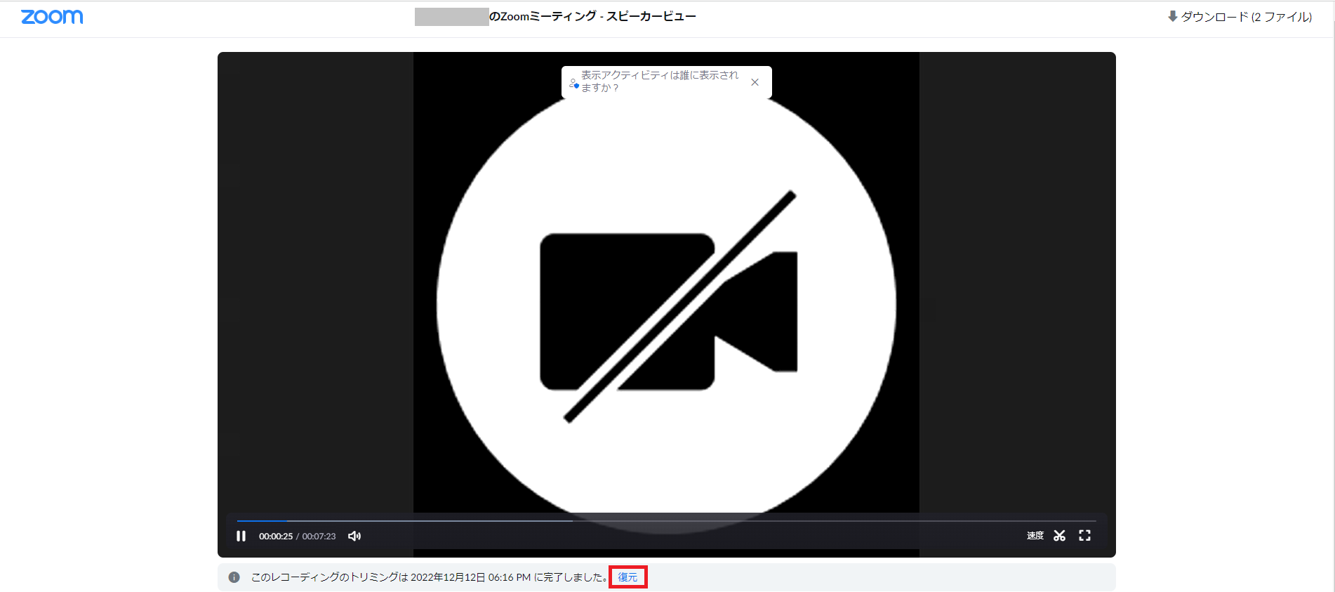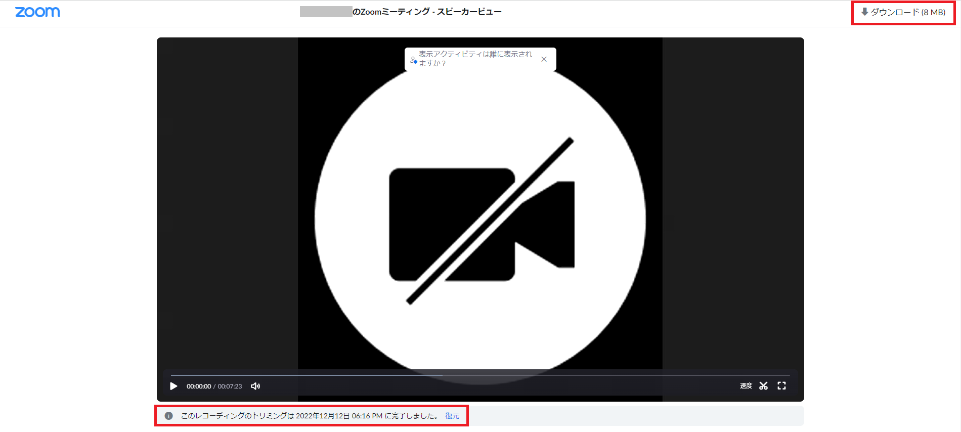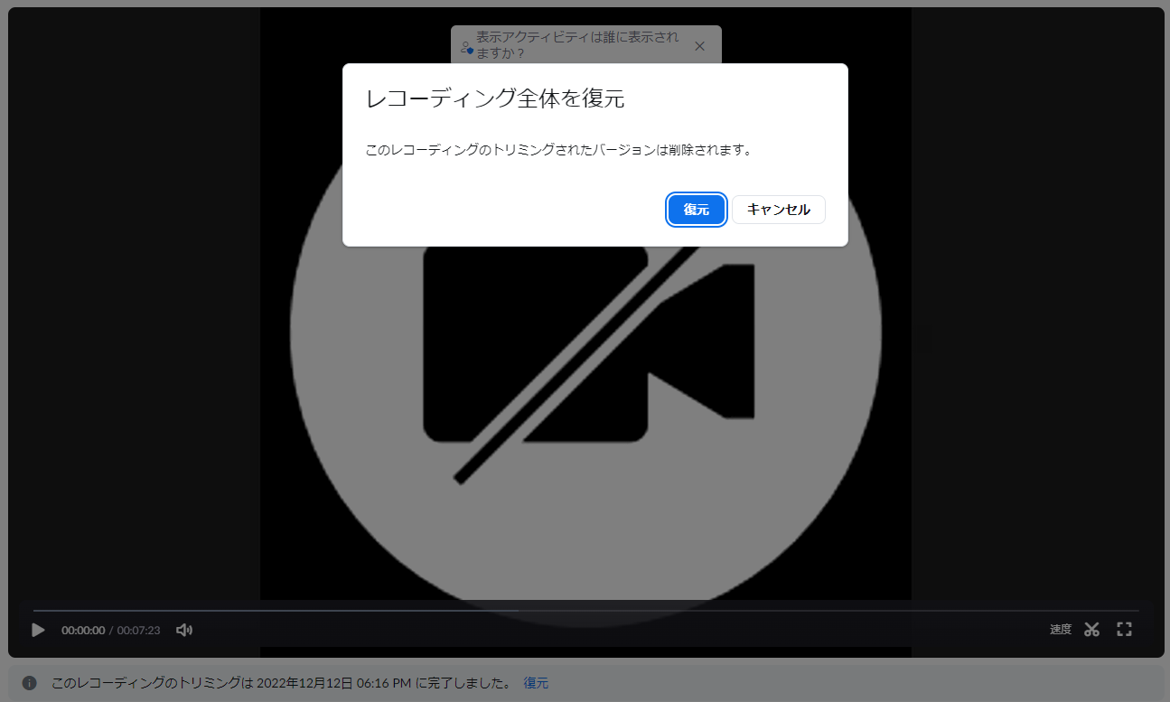 先ほどトリミングが完了した画面と同様のものになり、「復元」をクリックすることで元の動画に戻せます。