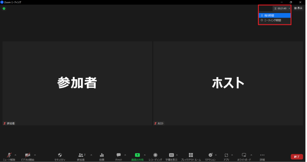 「経過時間」は、Zoomミーティングを始めた時間からカウントされます。