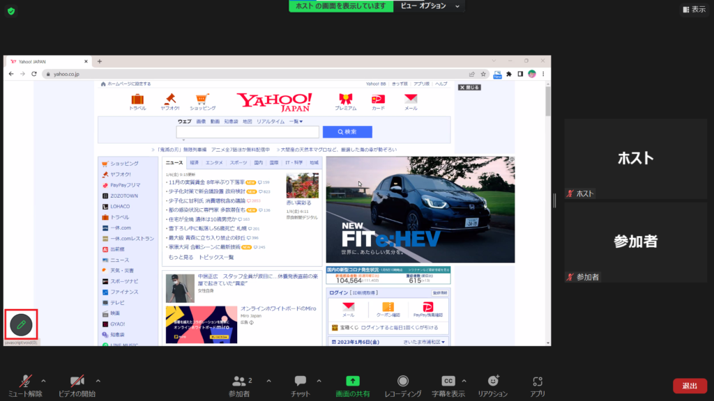 画面共有された後、画面左下に鉛筆マークが出るので、それをクリック。