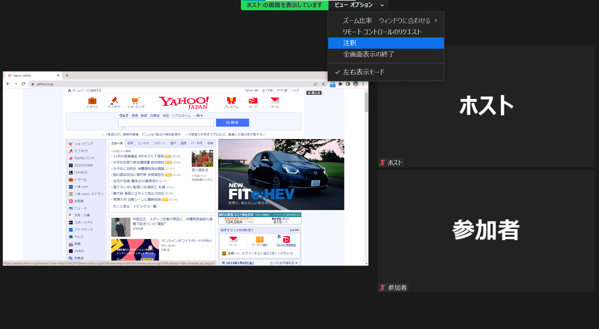 画面共有時に書き込みができる機能は以前からありましたが、以前は画面上にある「オプション」→「注釈」→「コメントを入れる」と操作が必要でした。