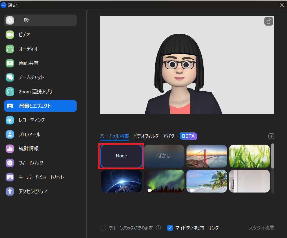 ちなみに、この状態で「アバターを表示」のチェックを外すと、バーチャル背景なしでビデオオンになるので注意してくださいね。お部屋が映ります。
