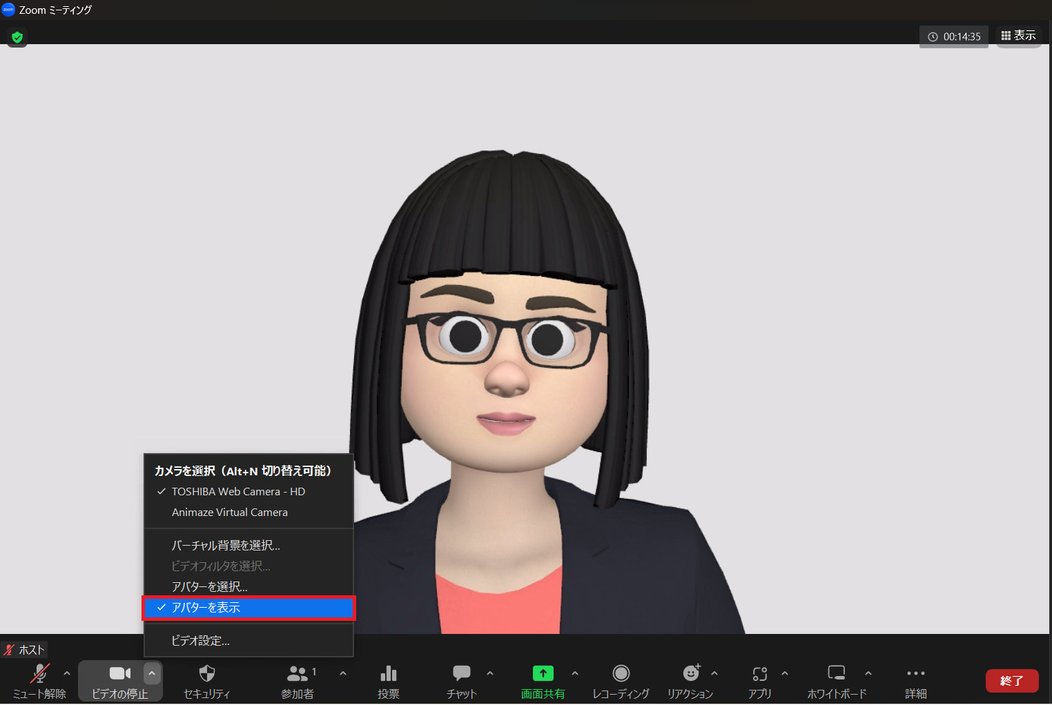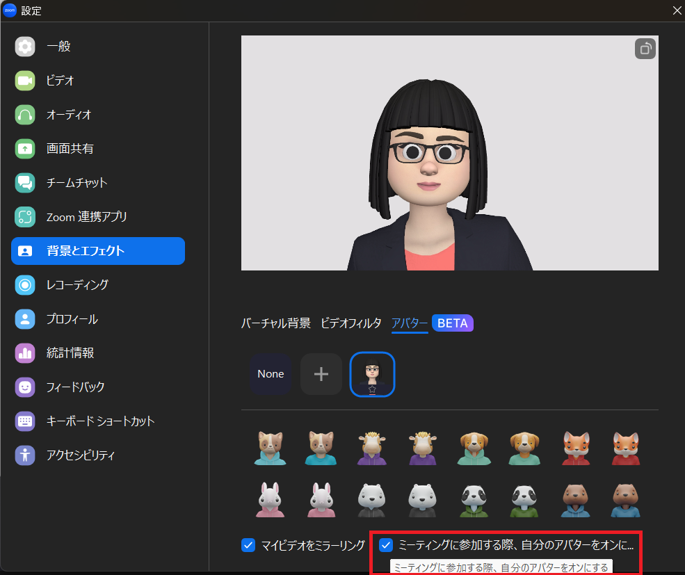 ミーティング参加時にアバターオンにしておくと、次回のミーティングからアバターで参加できます。