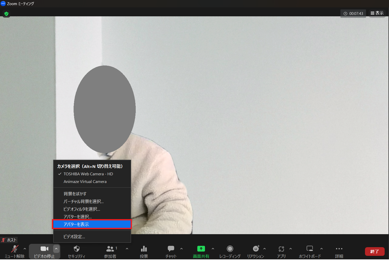 「ビデオ」の横にある▲マークから「アバターを表示」をクリックすると、