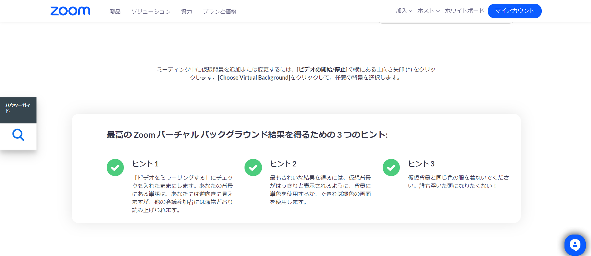 ビデオのミラーリングについてや「仮想背景と同じ色の服を着ないでください」など、よりZoomを快適に楽しむためのヒントが表示されます。